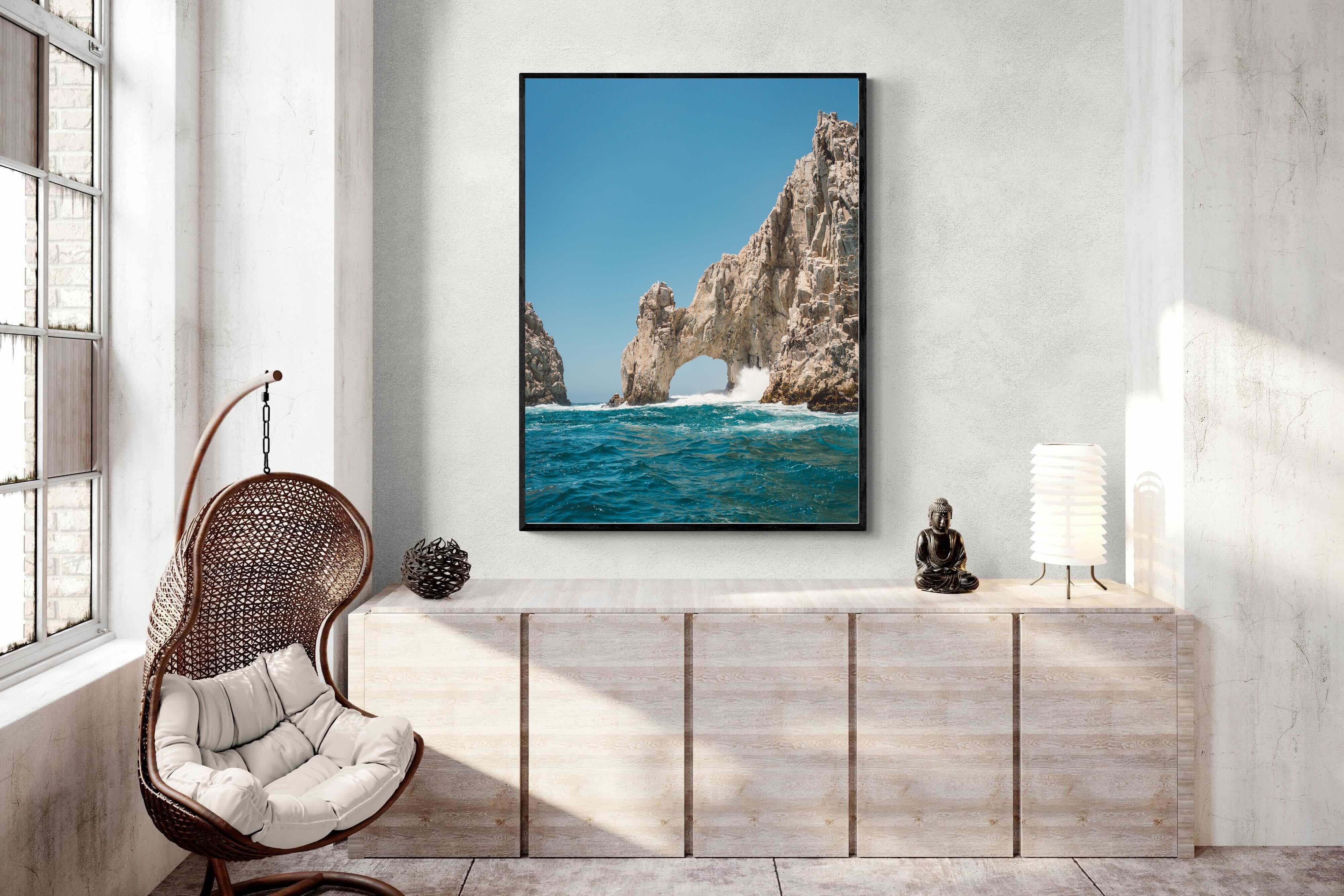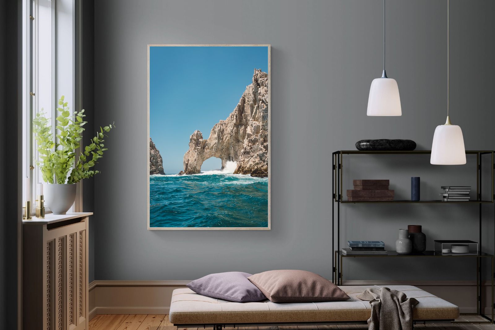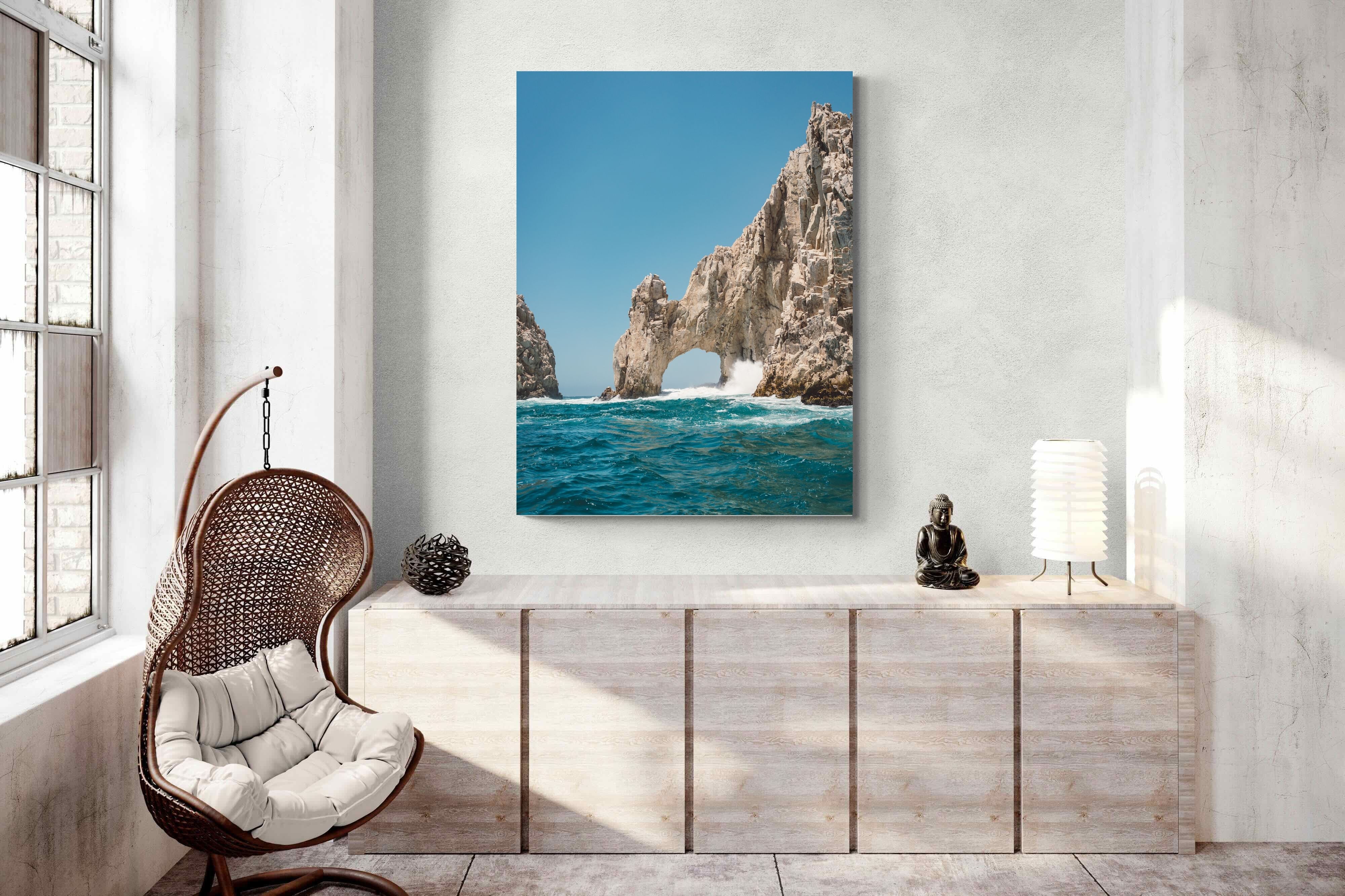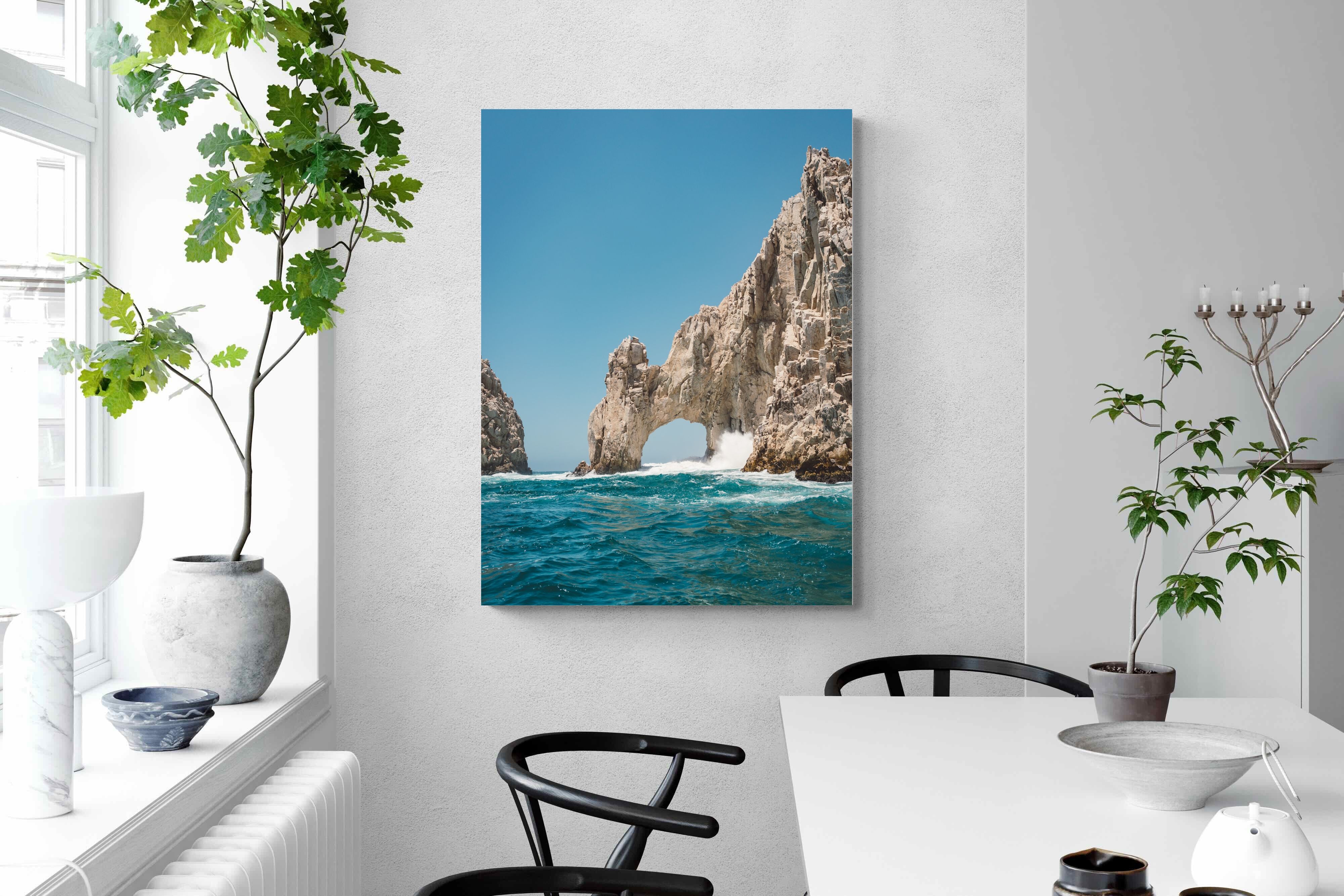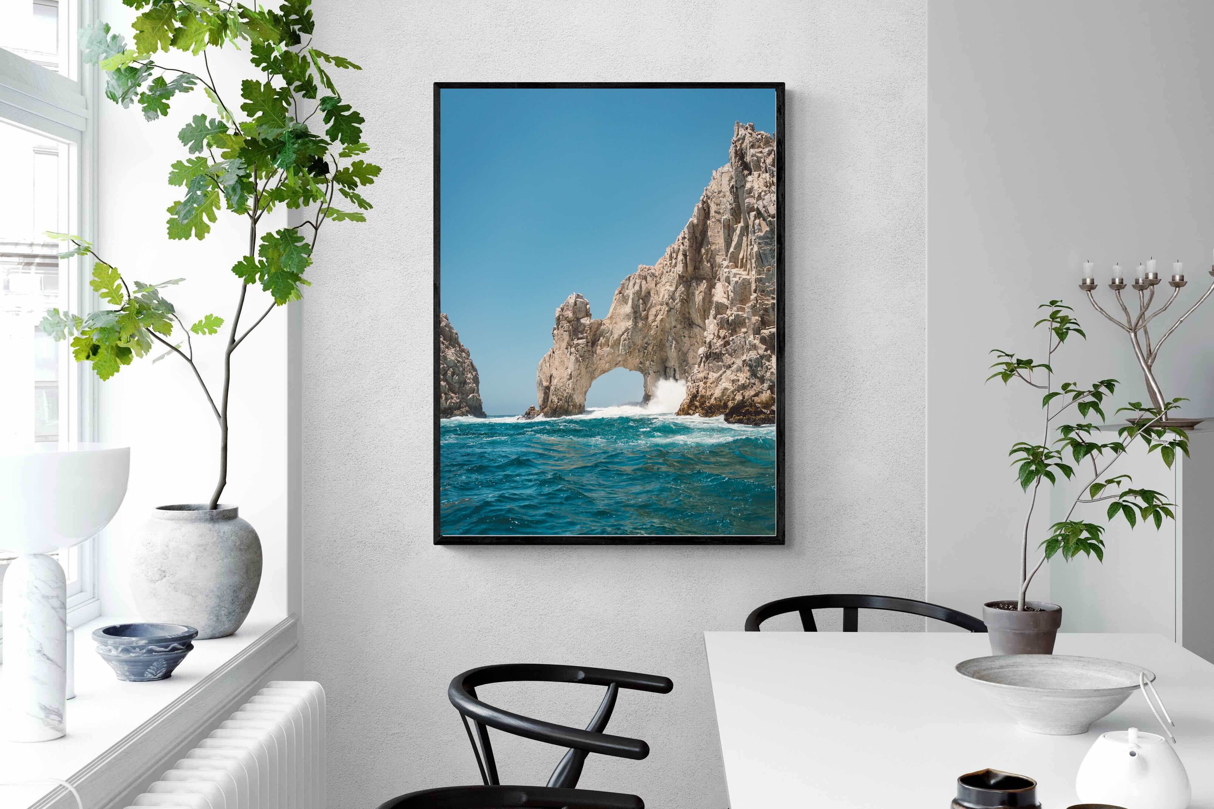 "Marine Gateway" captures the majestic Arch of Cabo San Lucas, where the rock formation carved by the sea stands as nature's monument. The clear blue waters, lively waves, and stark rock face against a clear sky offer a window to the natural world's enduring beauty. It would make an excellent wall art choice for a home, bringing a sense of adventure, tranquility, and the timeless beauty of the sea into any living space.