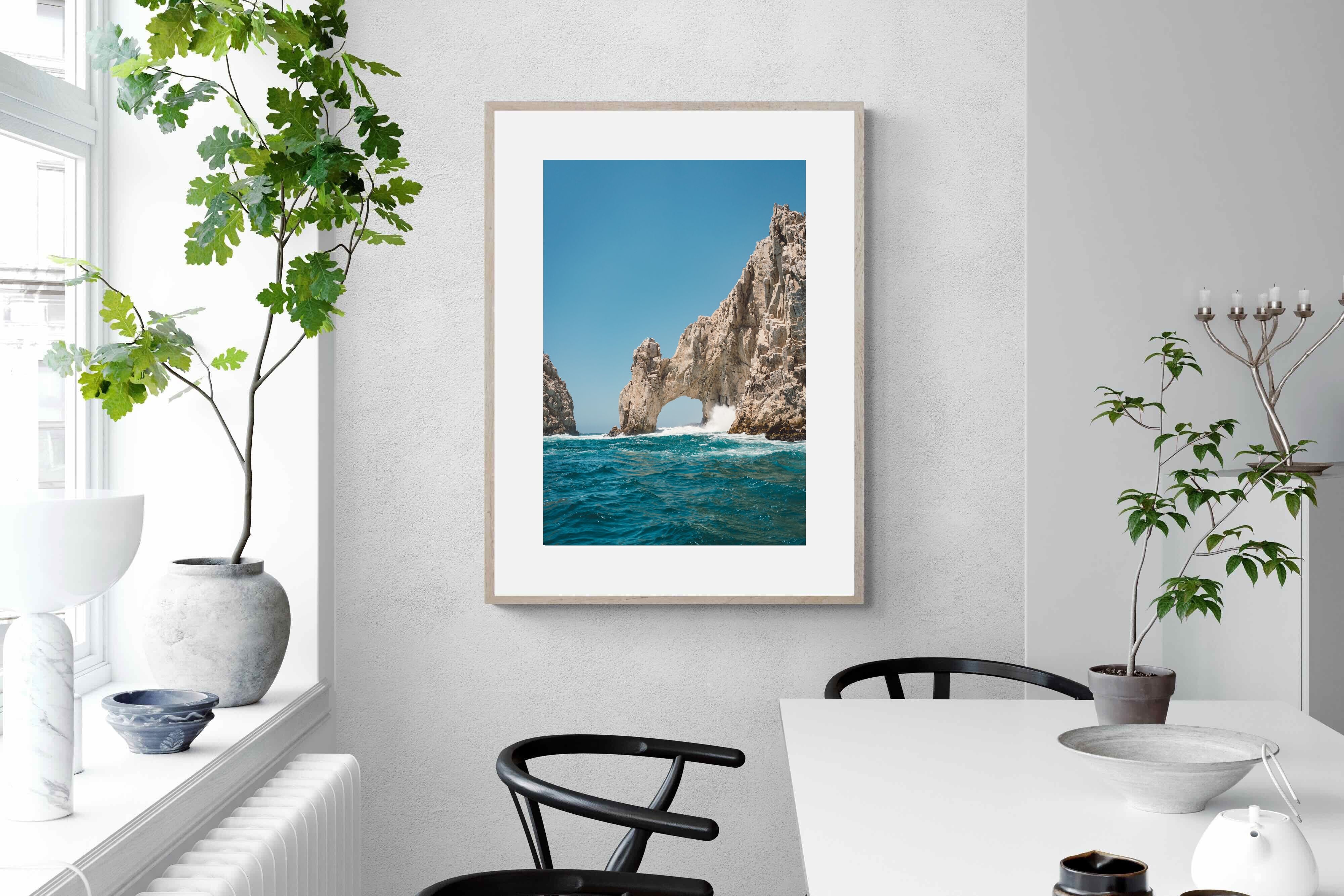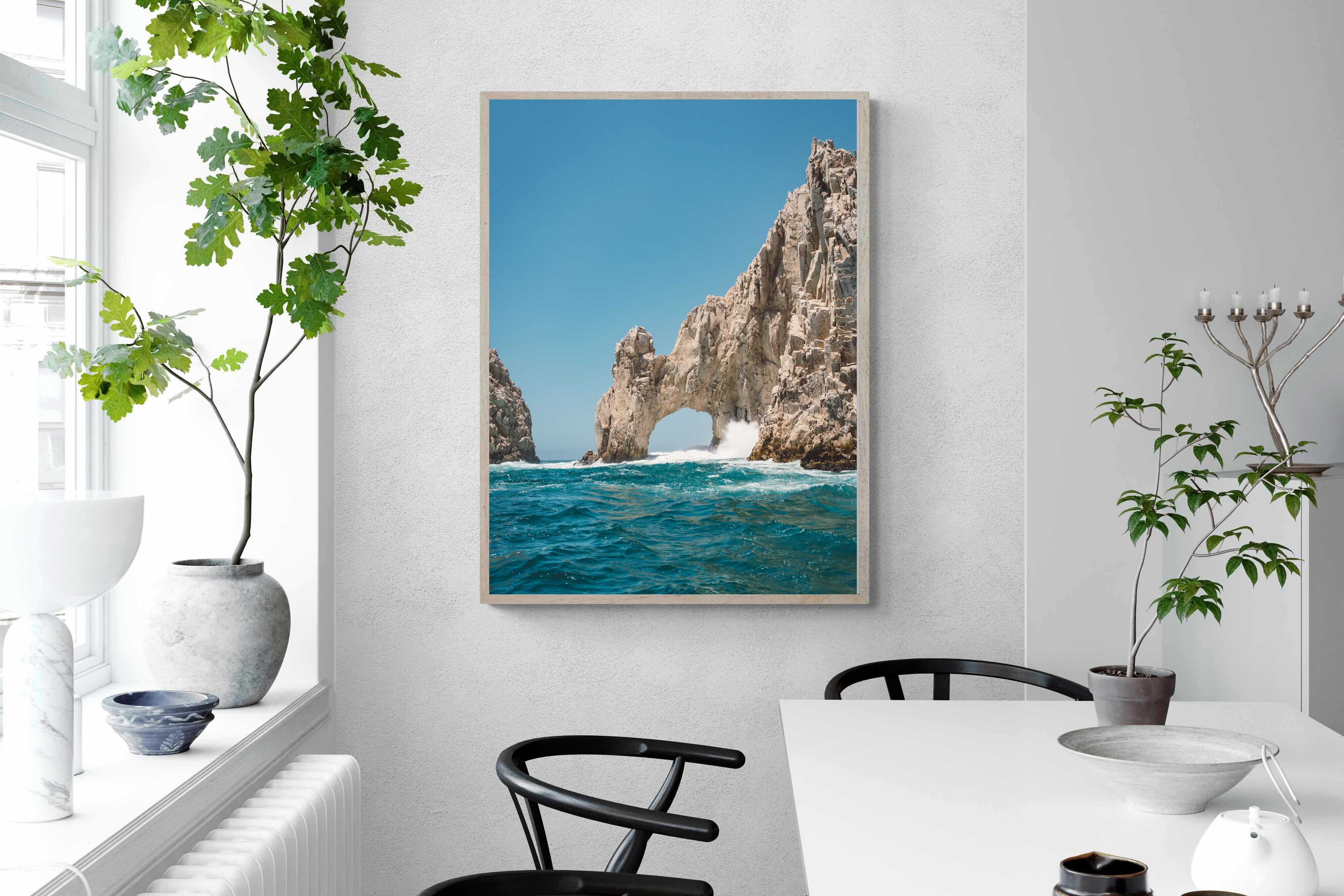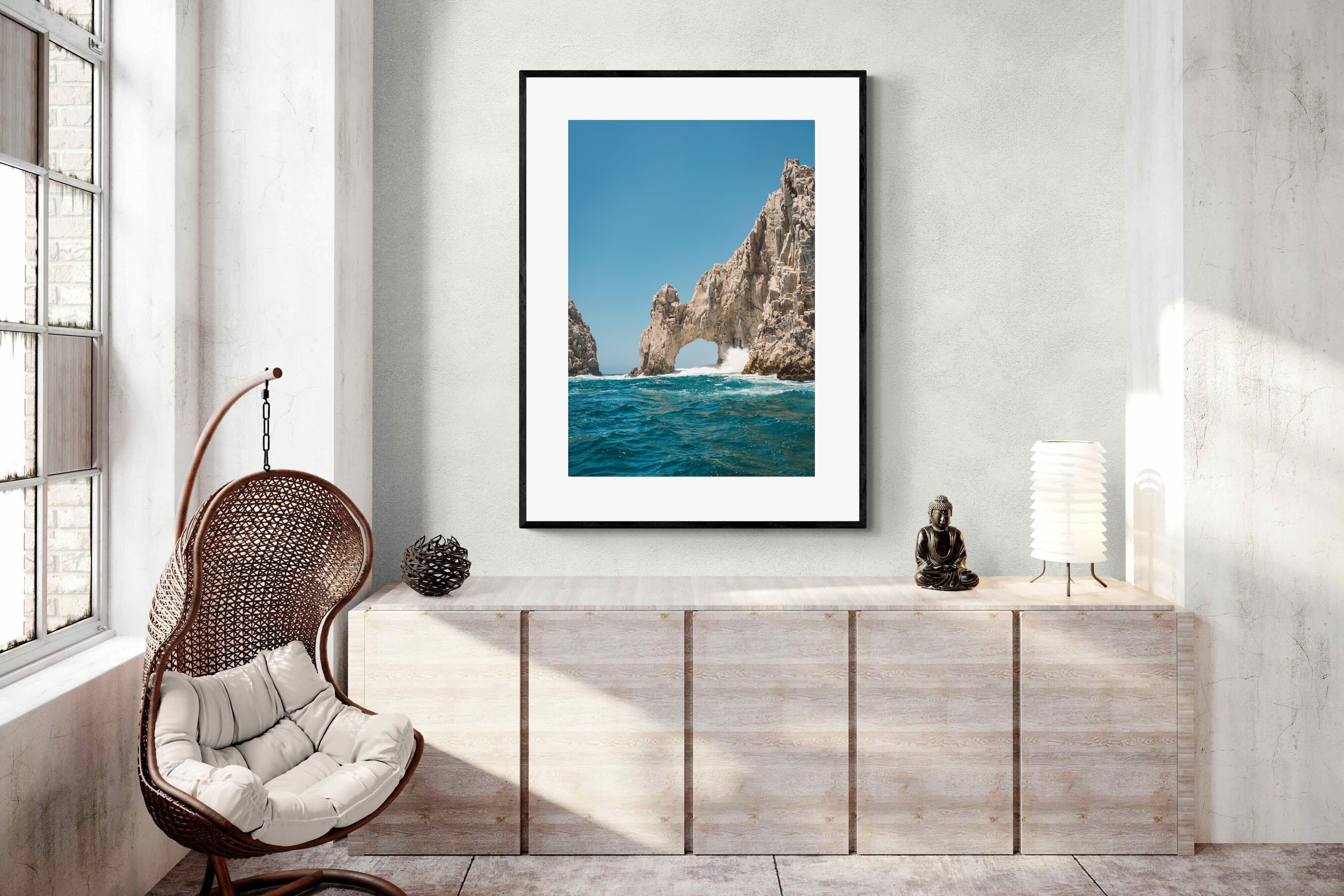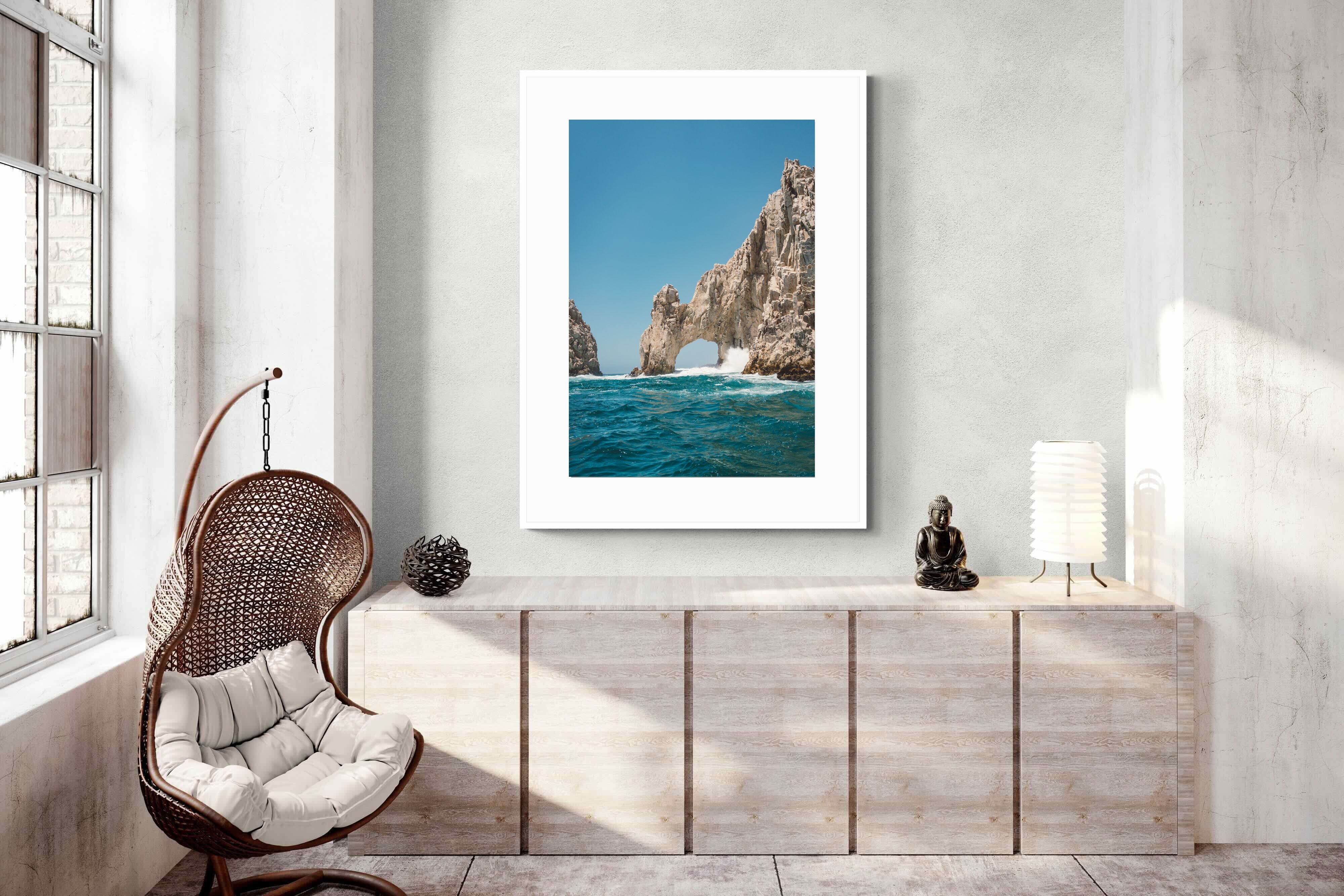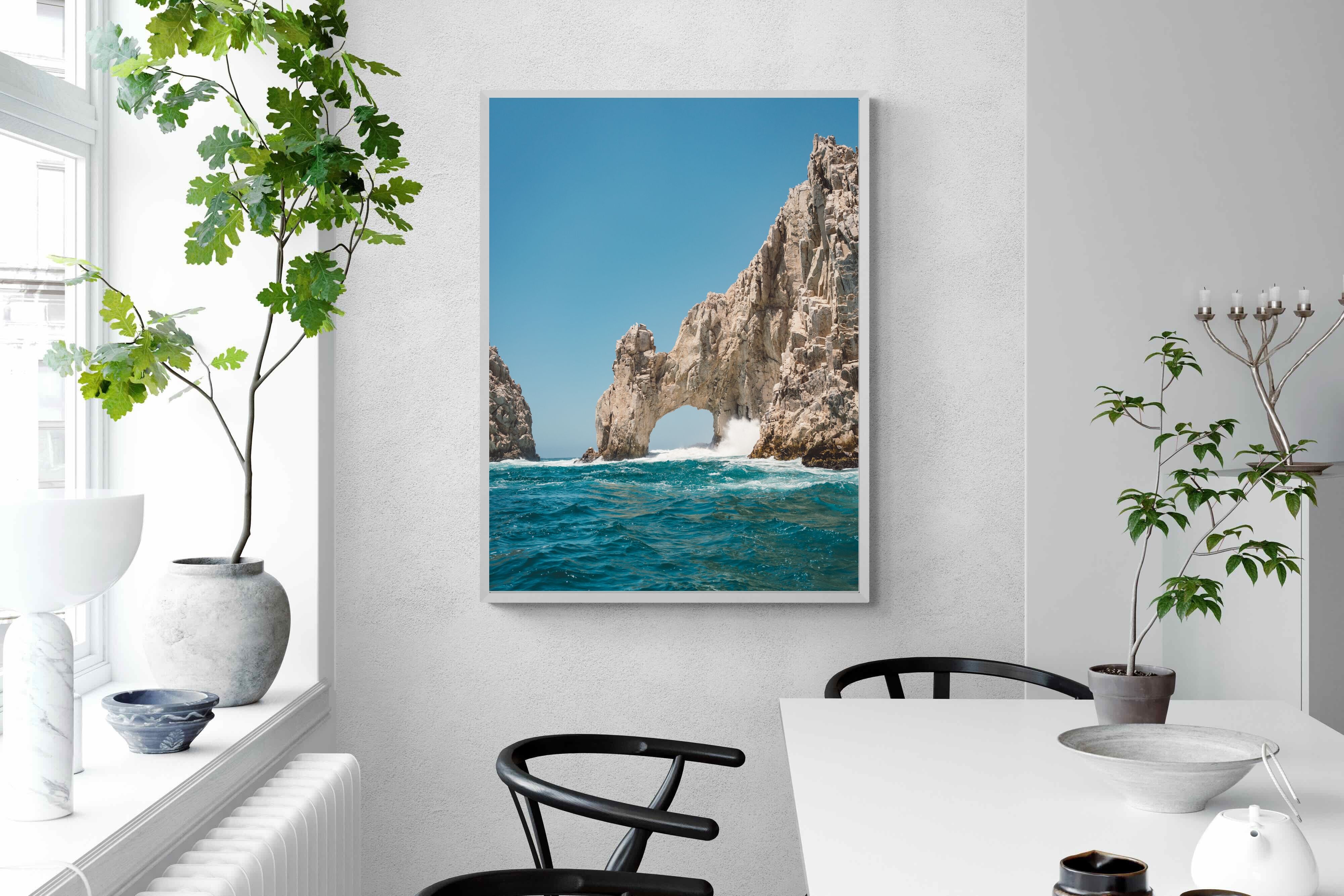 "Marine Gateway" captures the majestic Arch of Cabo San Lucas, where the rock formation carved by the sea stands as nature's monument. The clear blue waters, lively waves, and stark rock face against a clear sky offer a window to the natural world's enduring beauty. It would make an excellent wall art choice for a home, bringing a sense of adventure, tranquility, and the timeless beauty of the sea into any living space.