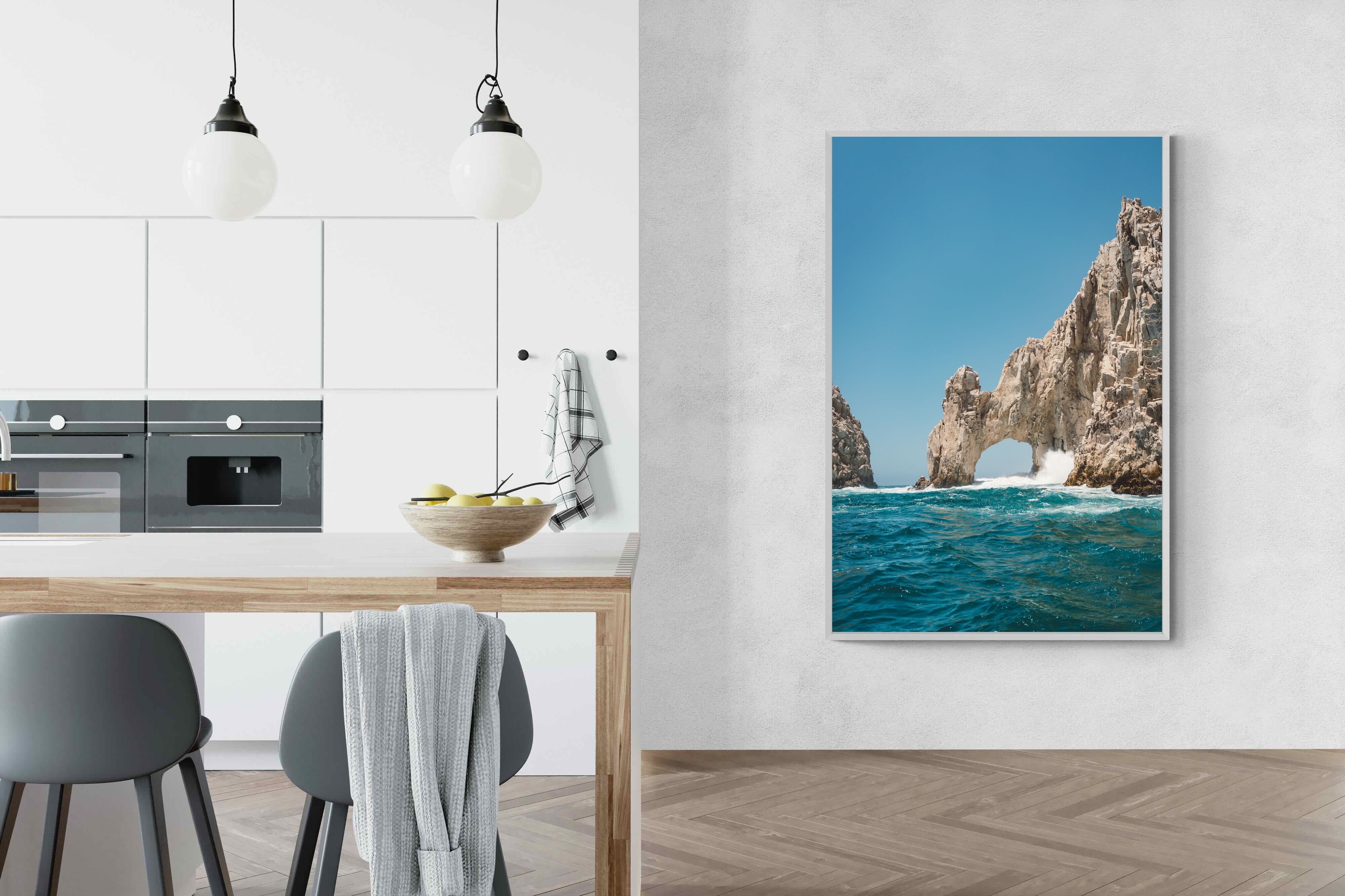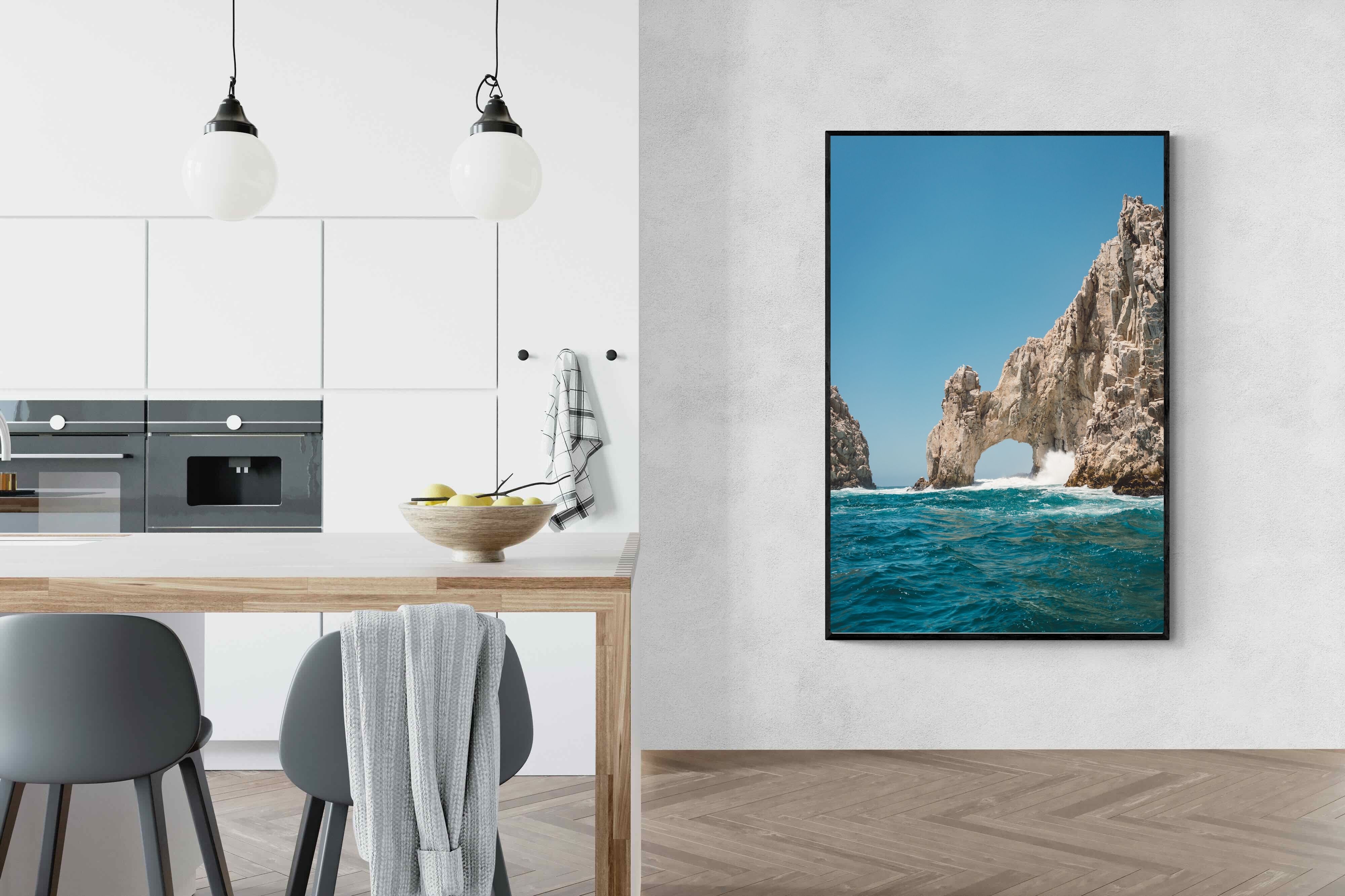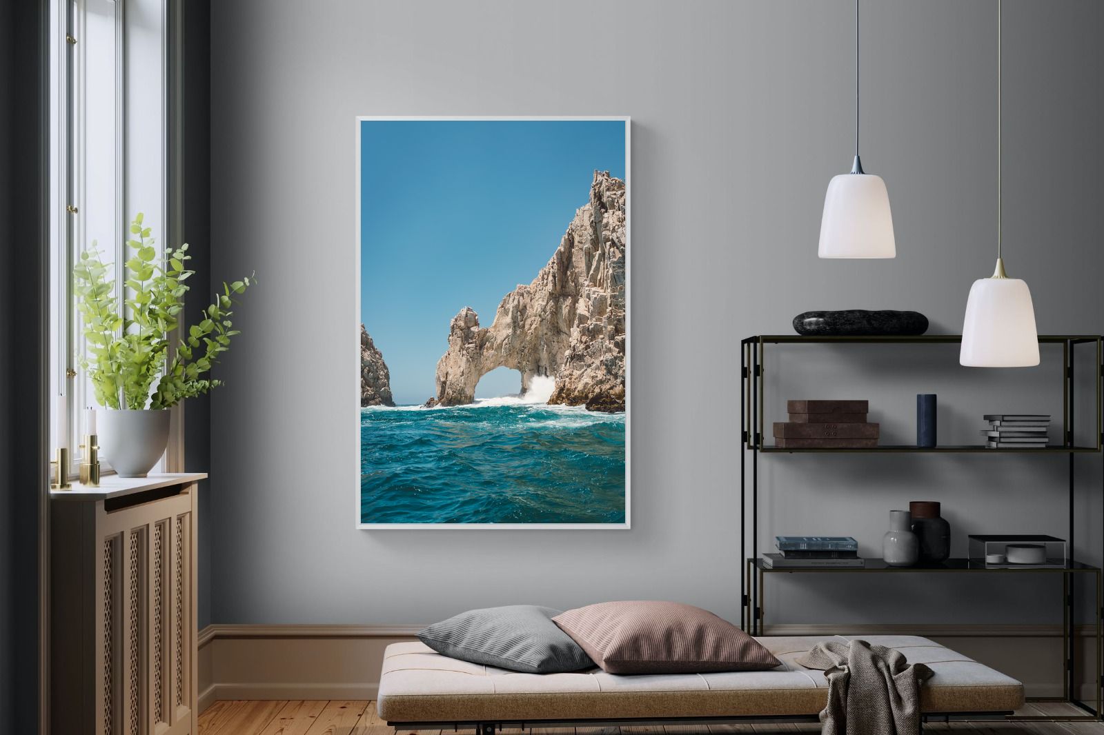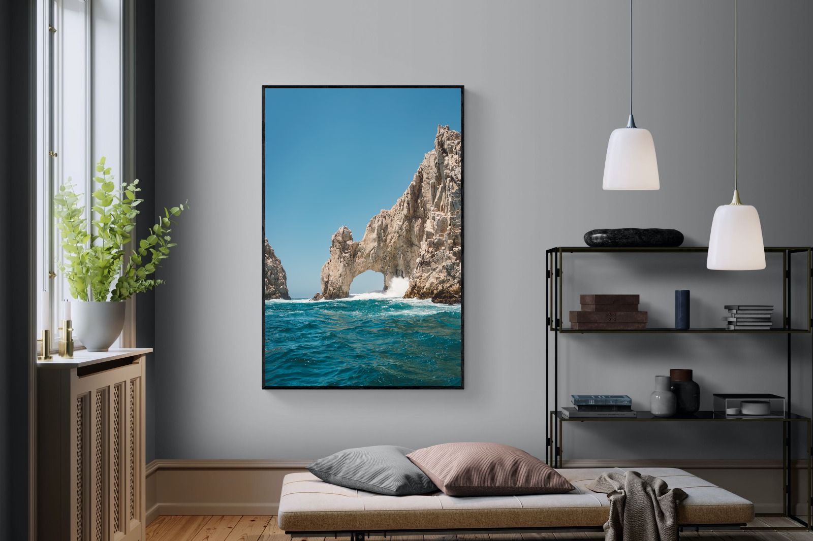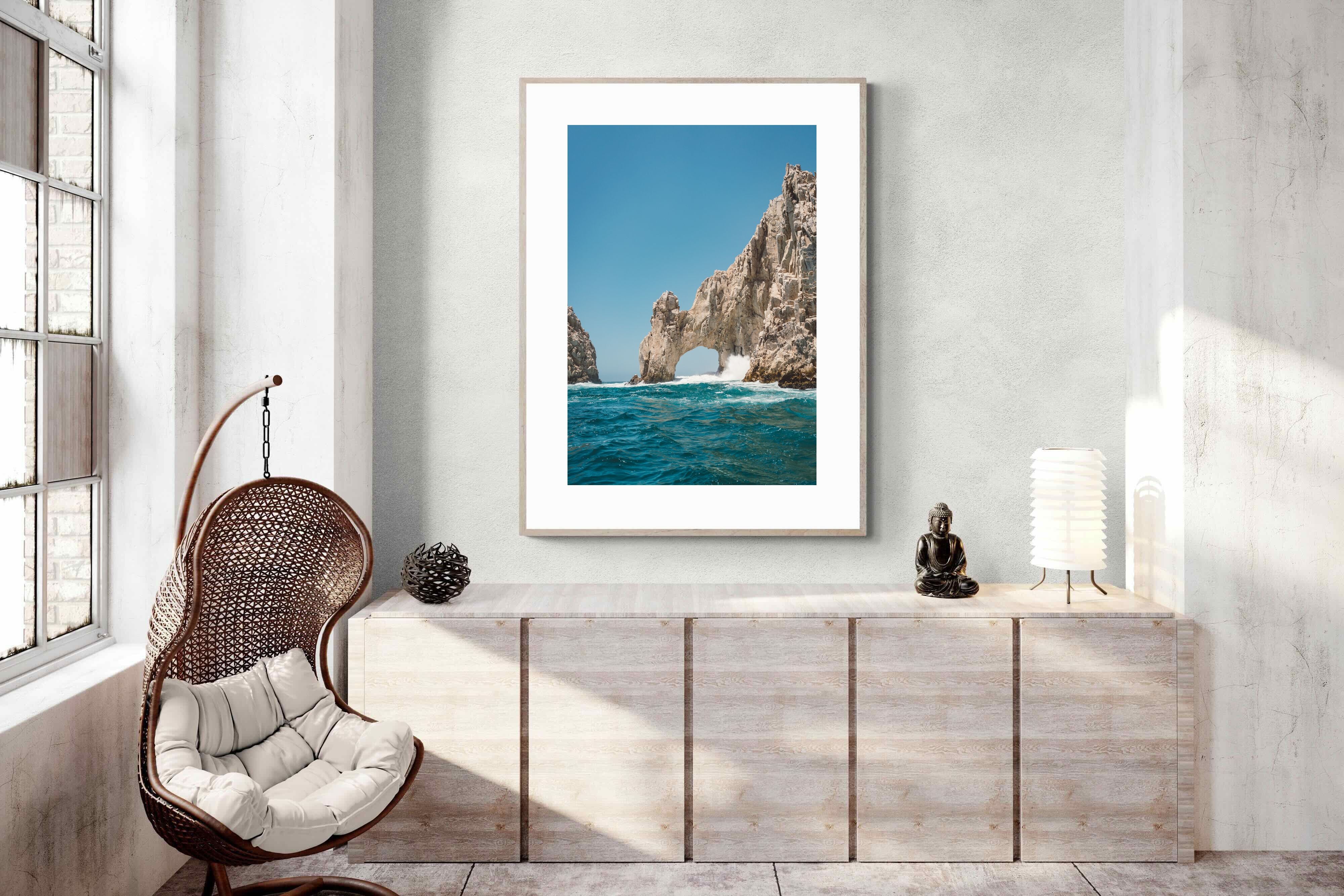 "Marine Gateway" captures the majestic Arch of Cabo San Lucas, where the rock formation carved by the sea stands as nature's monument. The clear blue waters, lively waves, and stark rock face against a clear sky offer a window to the natural world's enduring beauty. It would make an excellent wall art choice for a home, bringing a sense of adventure, tranquility, and the timeless beauty of the sea into any living space.