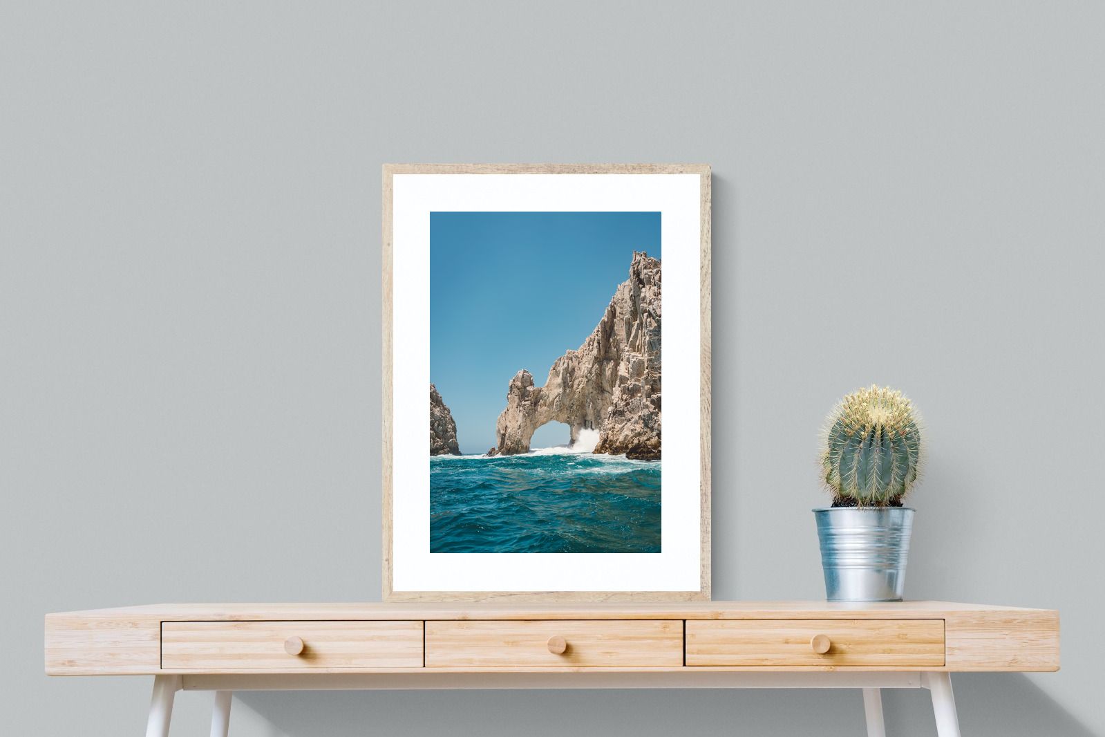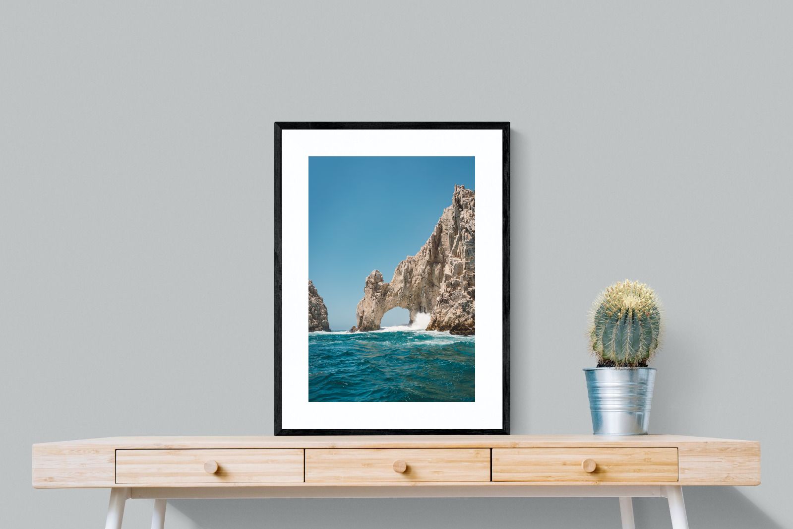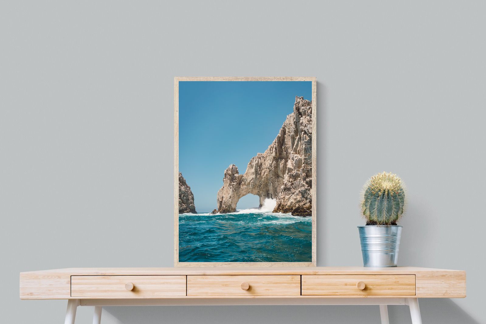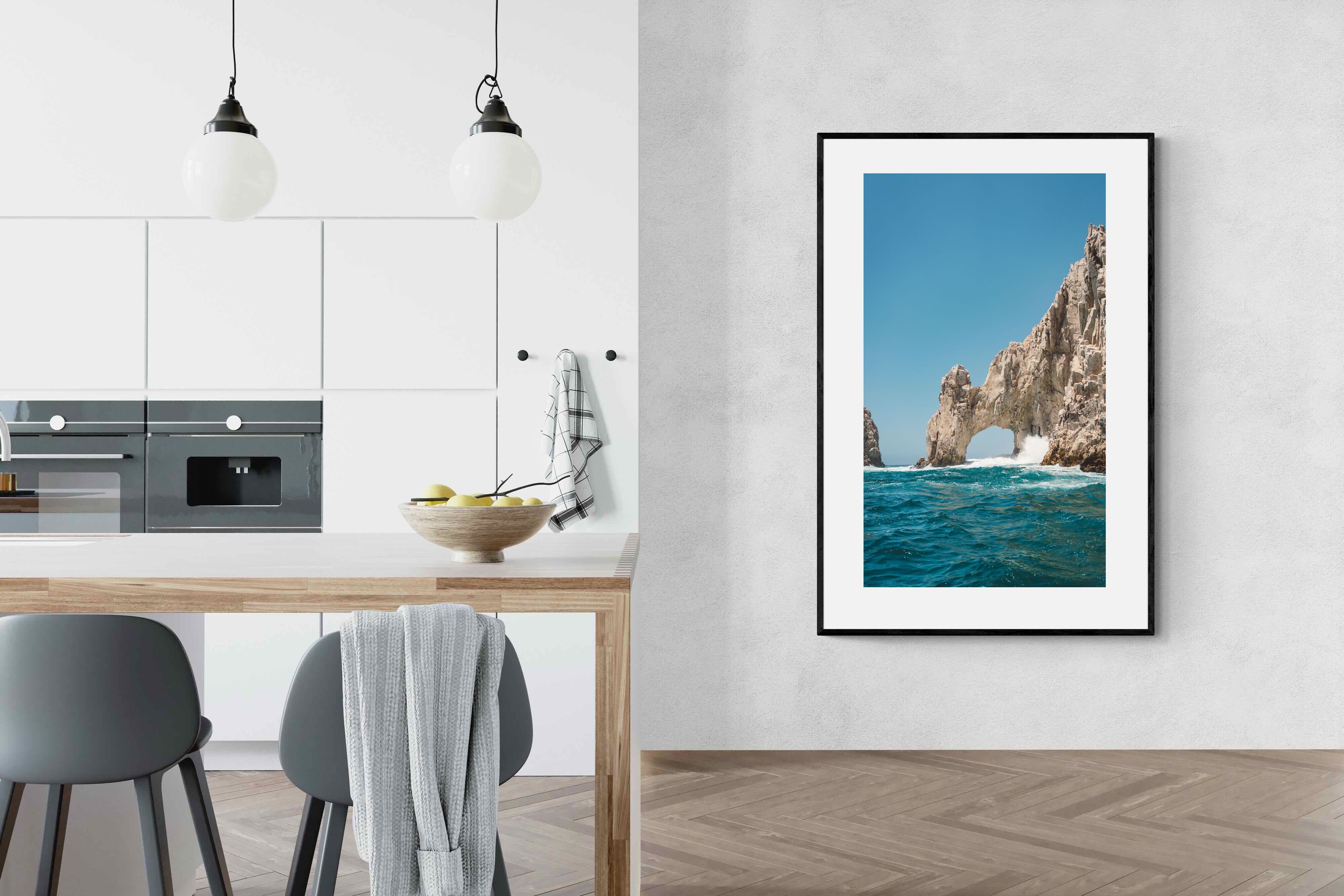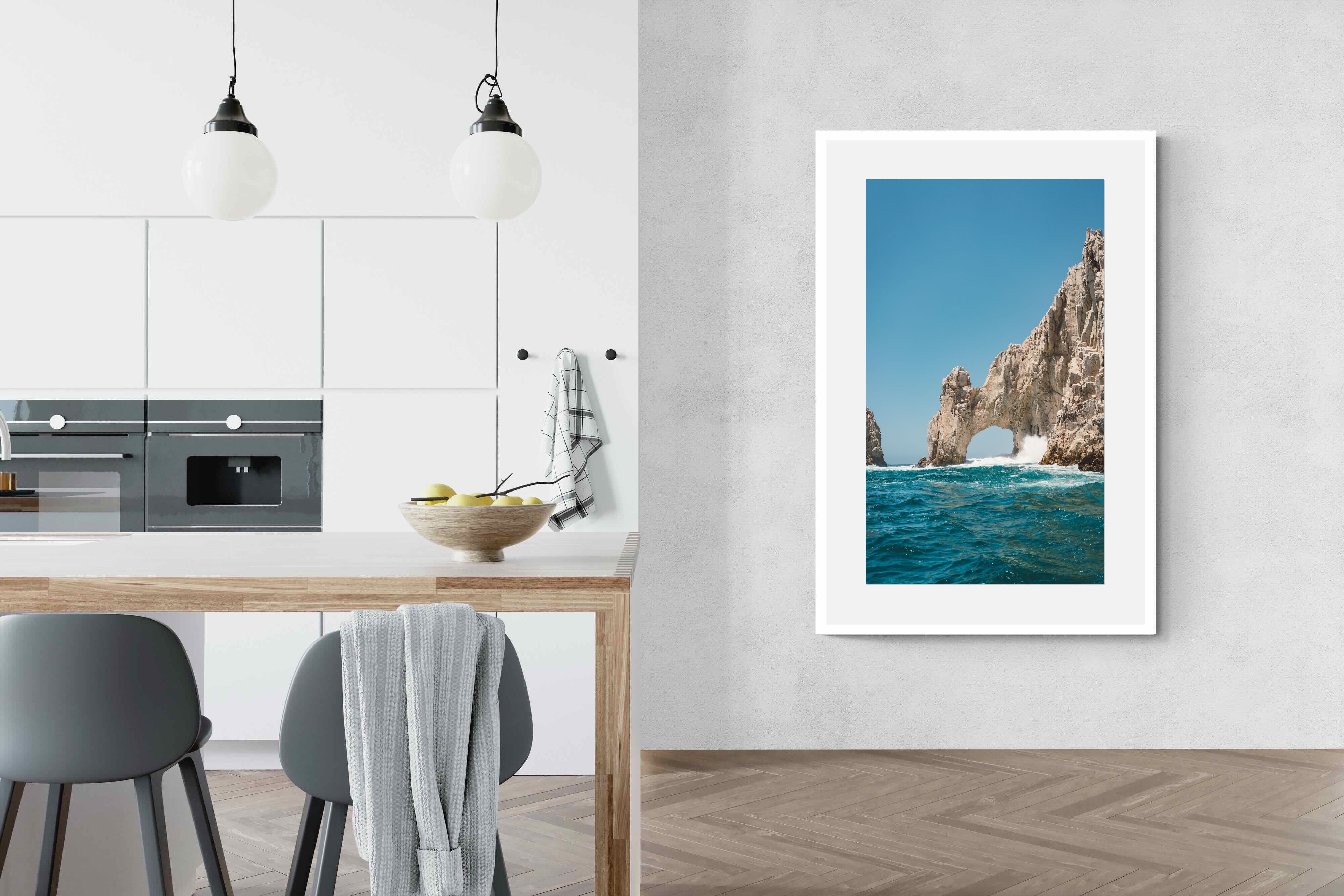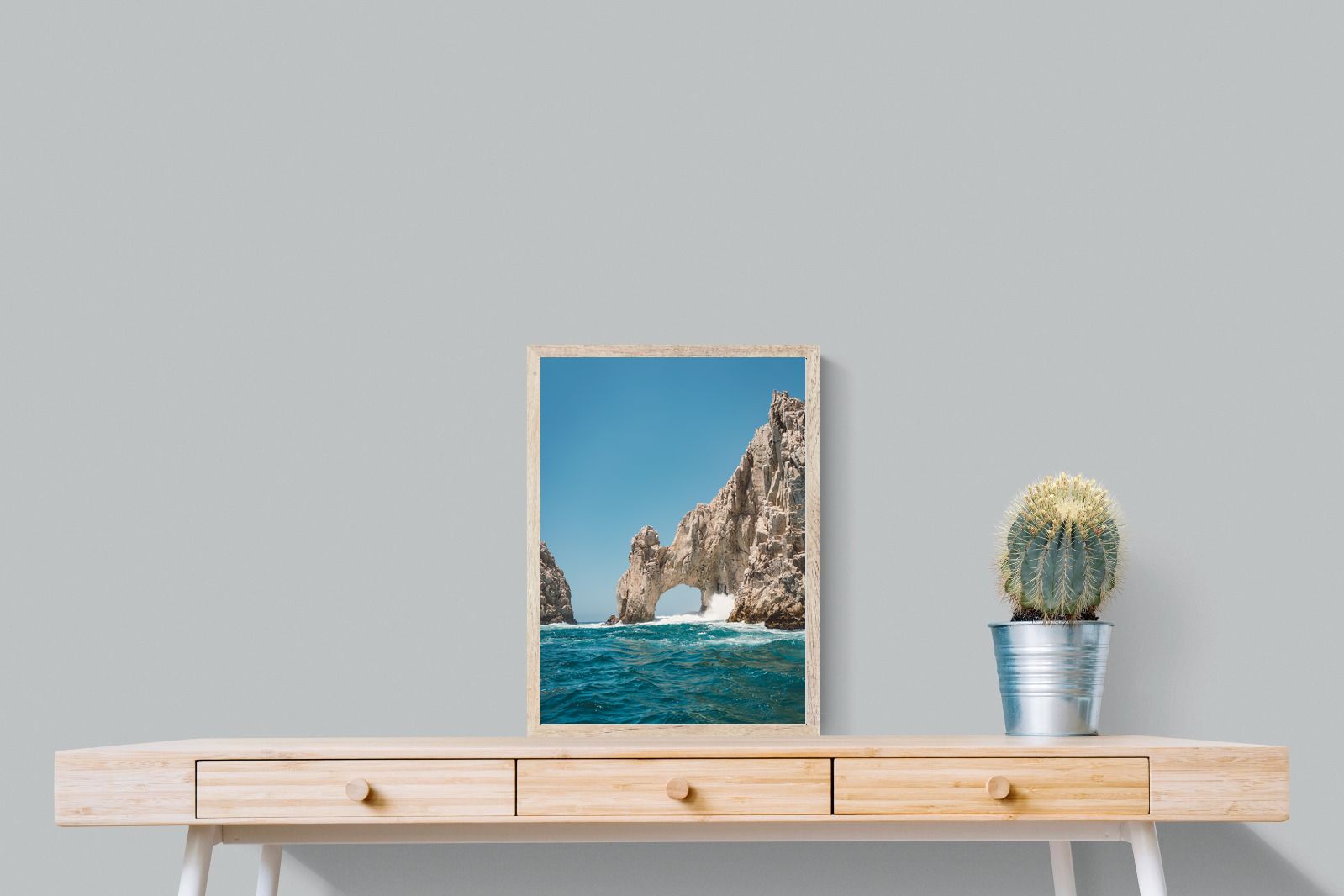 "Marine Gateway" captures the majestic Arch of Cabo San Lucas, where the rock formation carved by the sea stands as nature's monument. The clear blue waters, lively waves, and stark rock face against a clear sky offer a window to the natural world's enduring beauty. It would make an excellent wall art choice for a home, bringing a sense of adventure, tranquility, and the timeless beauty of the sea into any living space.