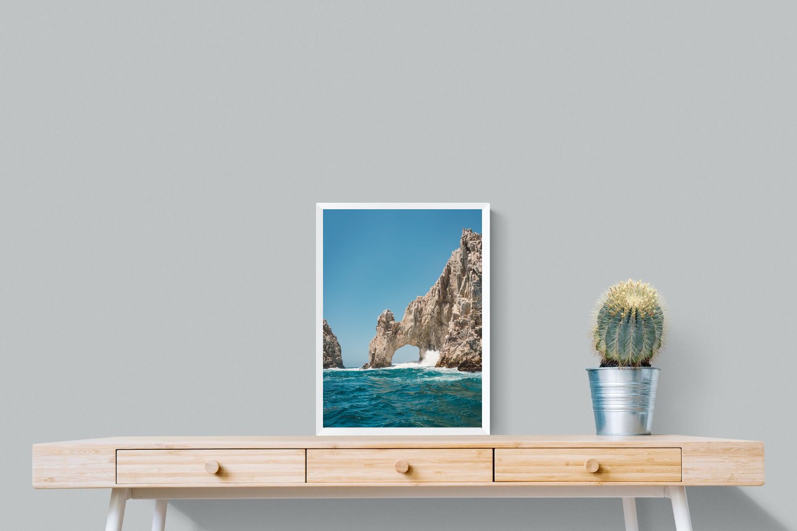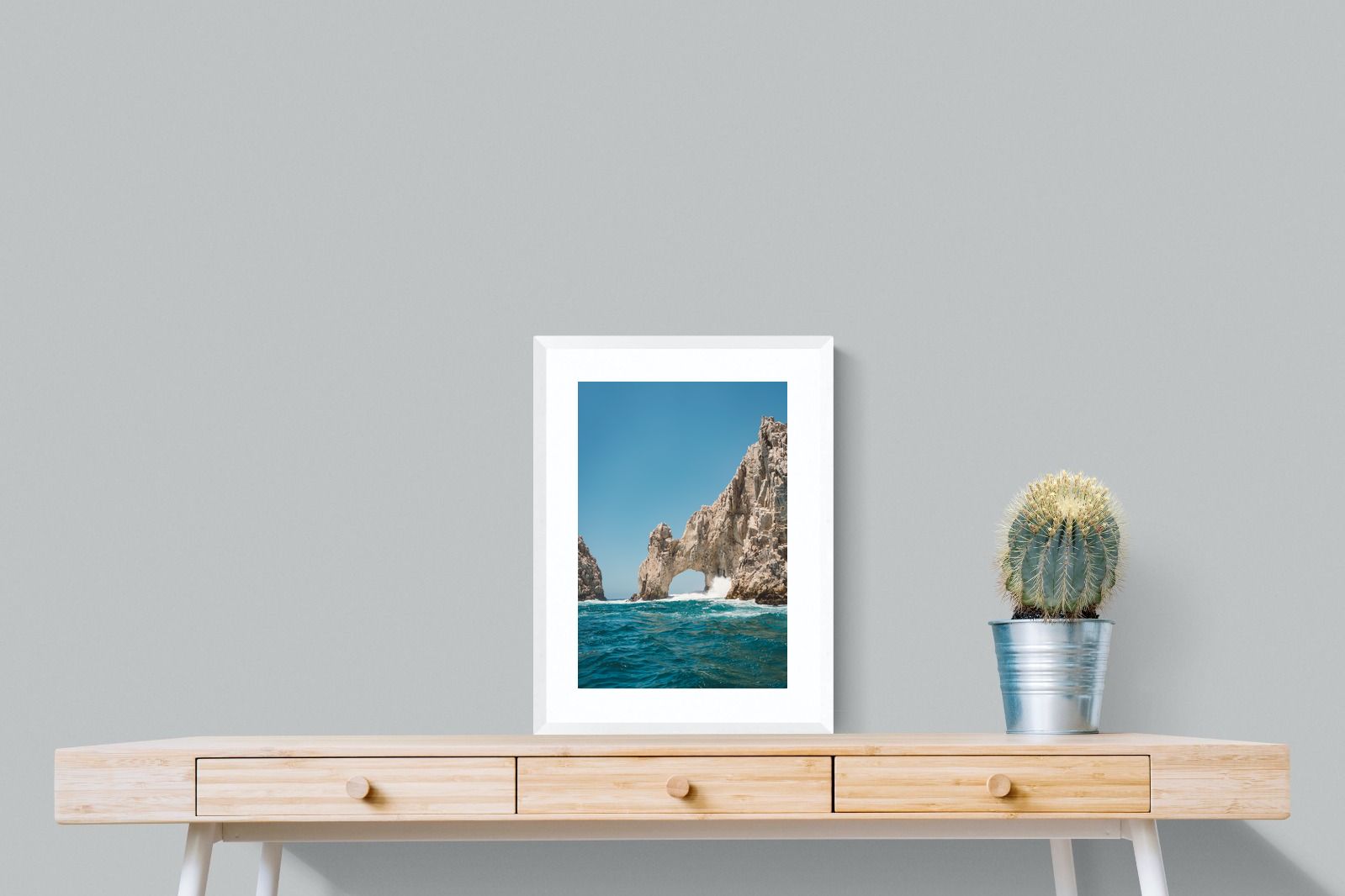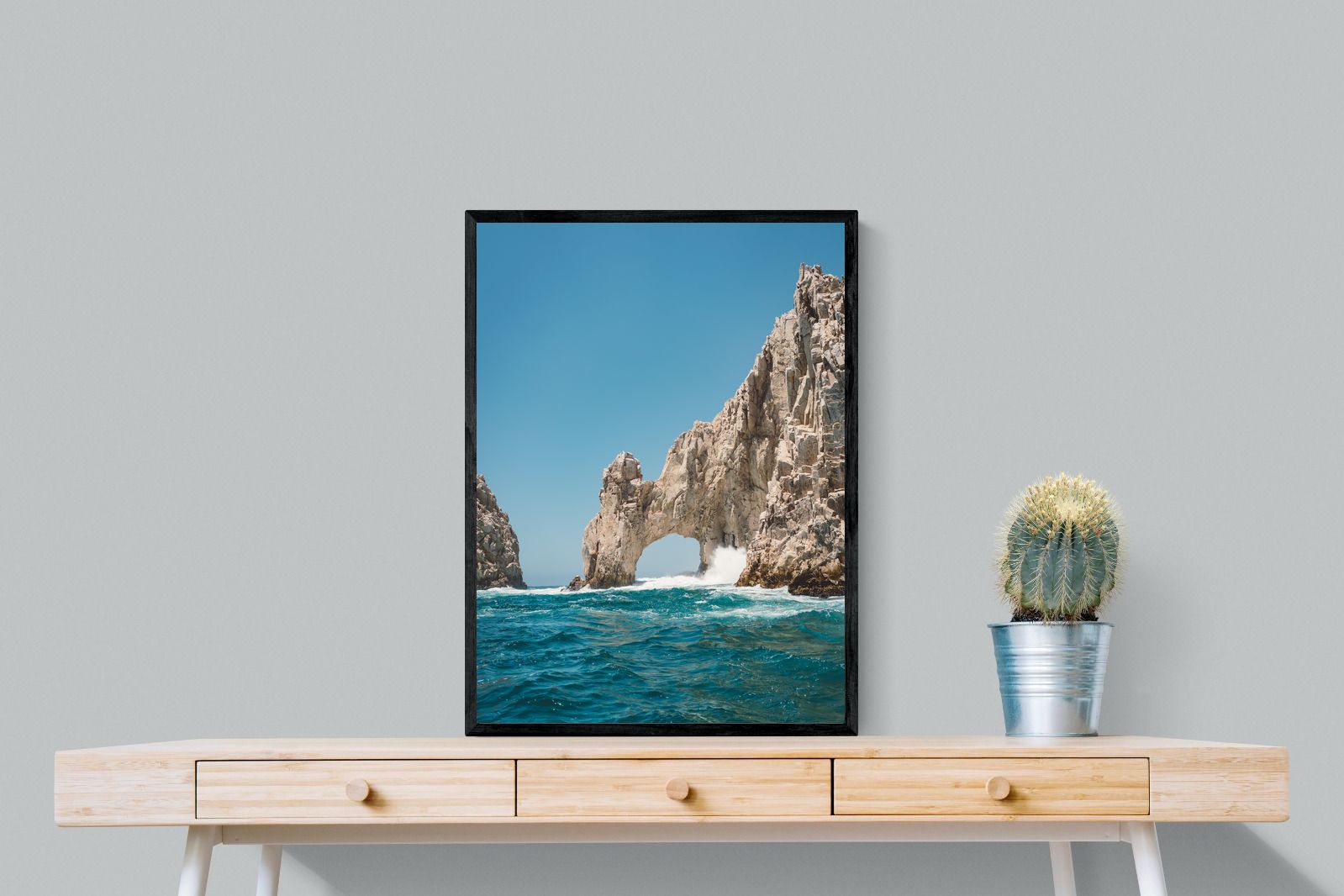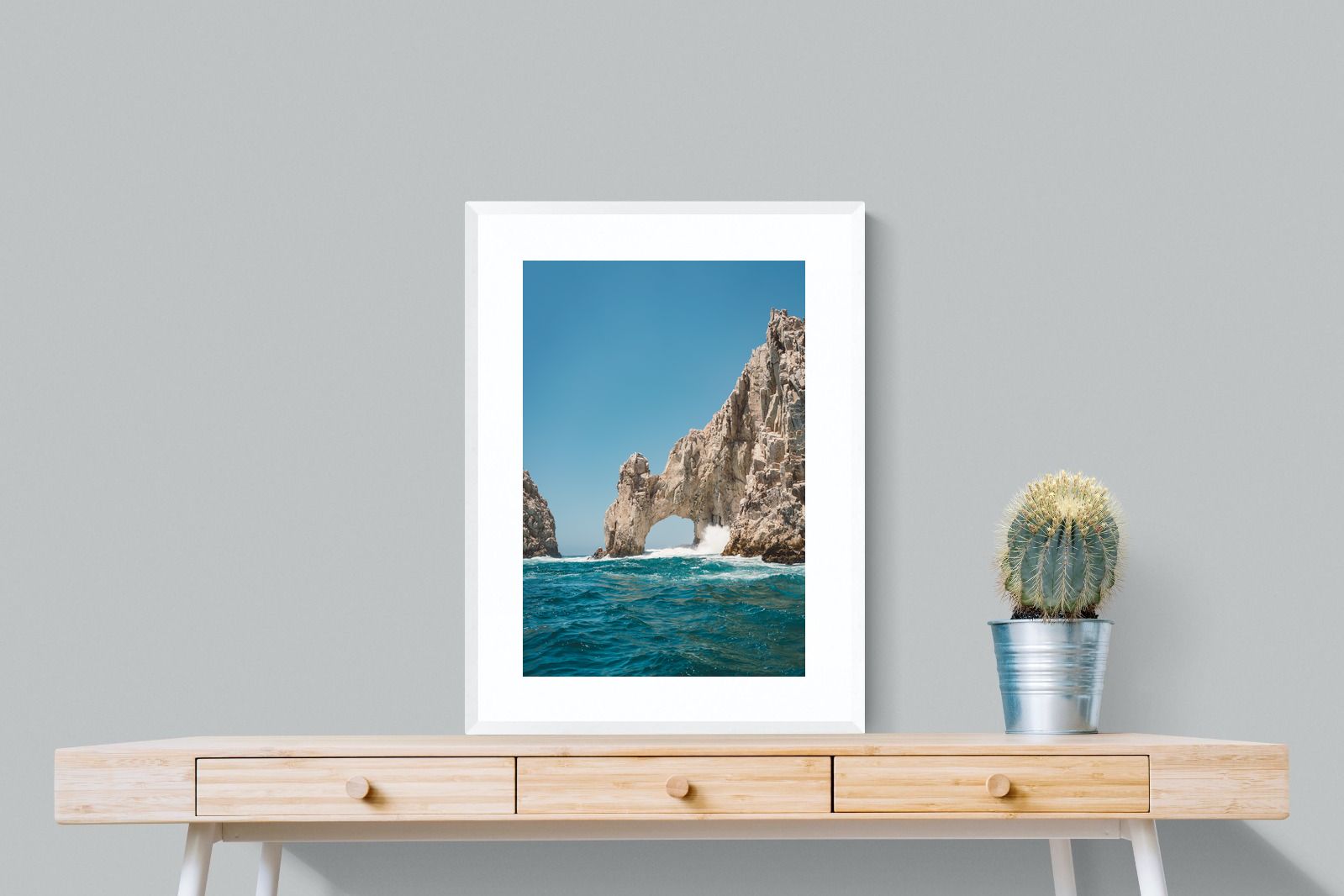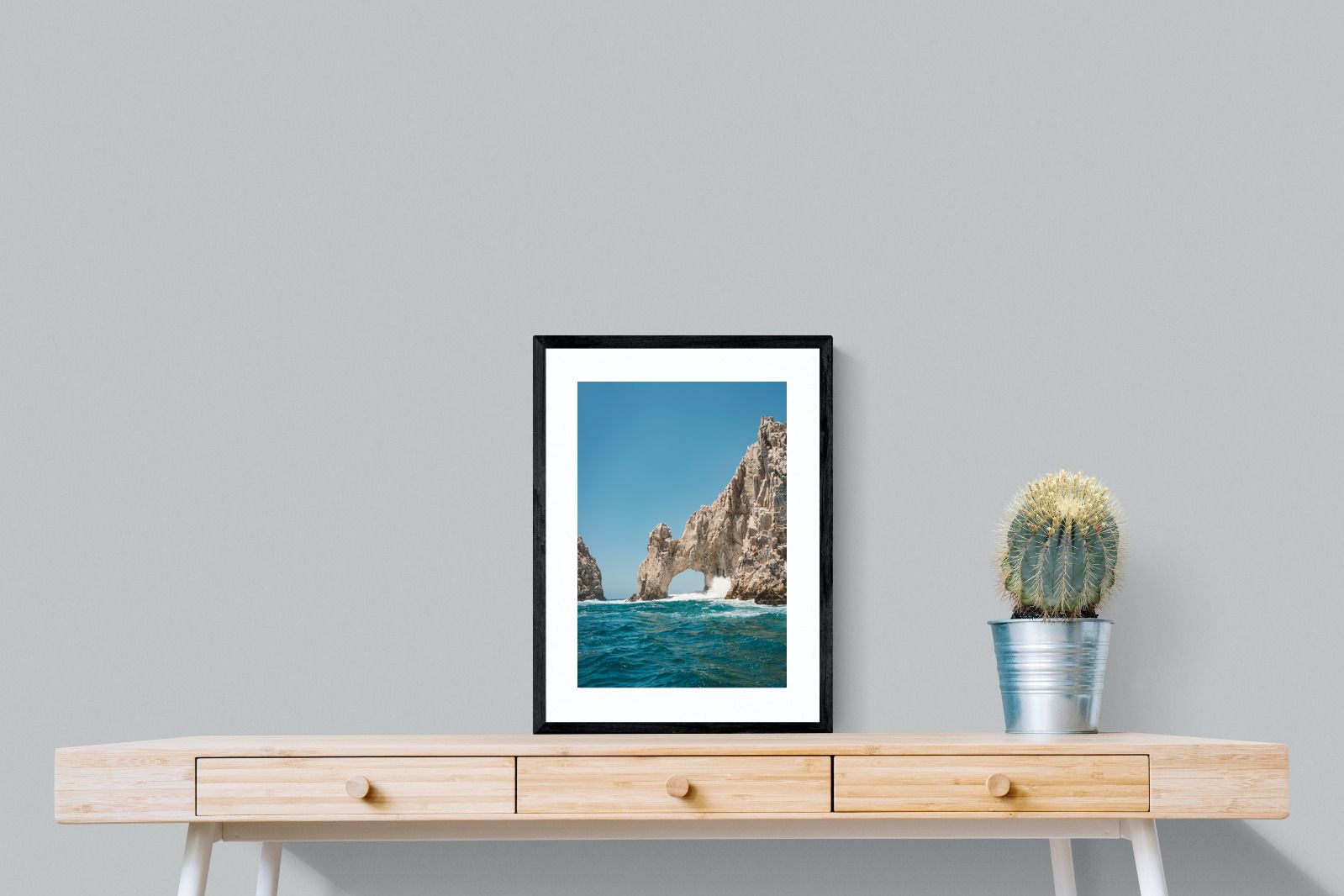 "Marine Gateway" captures the majestic Arch of Cabo San Lucas, where the rock formation carved by the sea stands as nature's monument. The clear blue waters, lively waves, and stark rock face against a clear sky offer a window to the natural world's enduring beauty. It would make an excellent wall art choice for a home, bringing a sense of adventure, tranquility, and the timeless beauty of the sea into any living space.