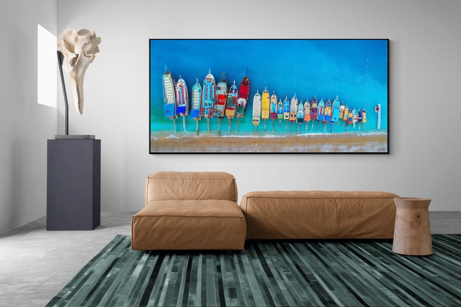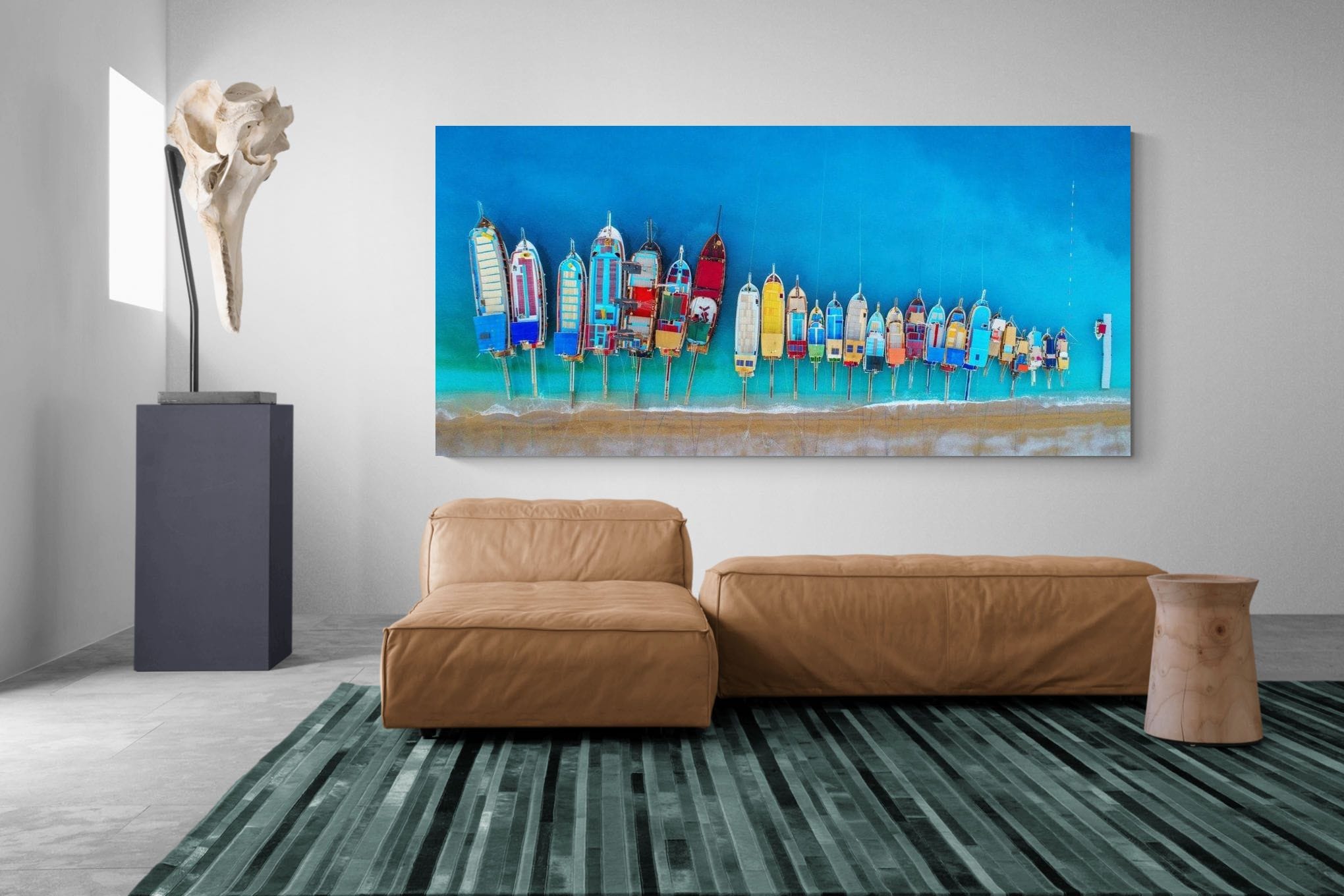 A vibrant row of moored boats forms a striking line of colour against calm turquoise water. Viewed from above, the vessels create a rhythmic pattern of reds, blues, yellows and whites along the shoreline. The graphic composition and playful palette give the image a joyful, contemporary feel. This lively coastal artwork adds colour and movement to interiors, making it a perfect statement piece for modern homes or relaxed seaside spaces.