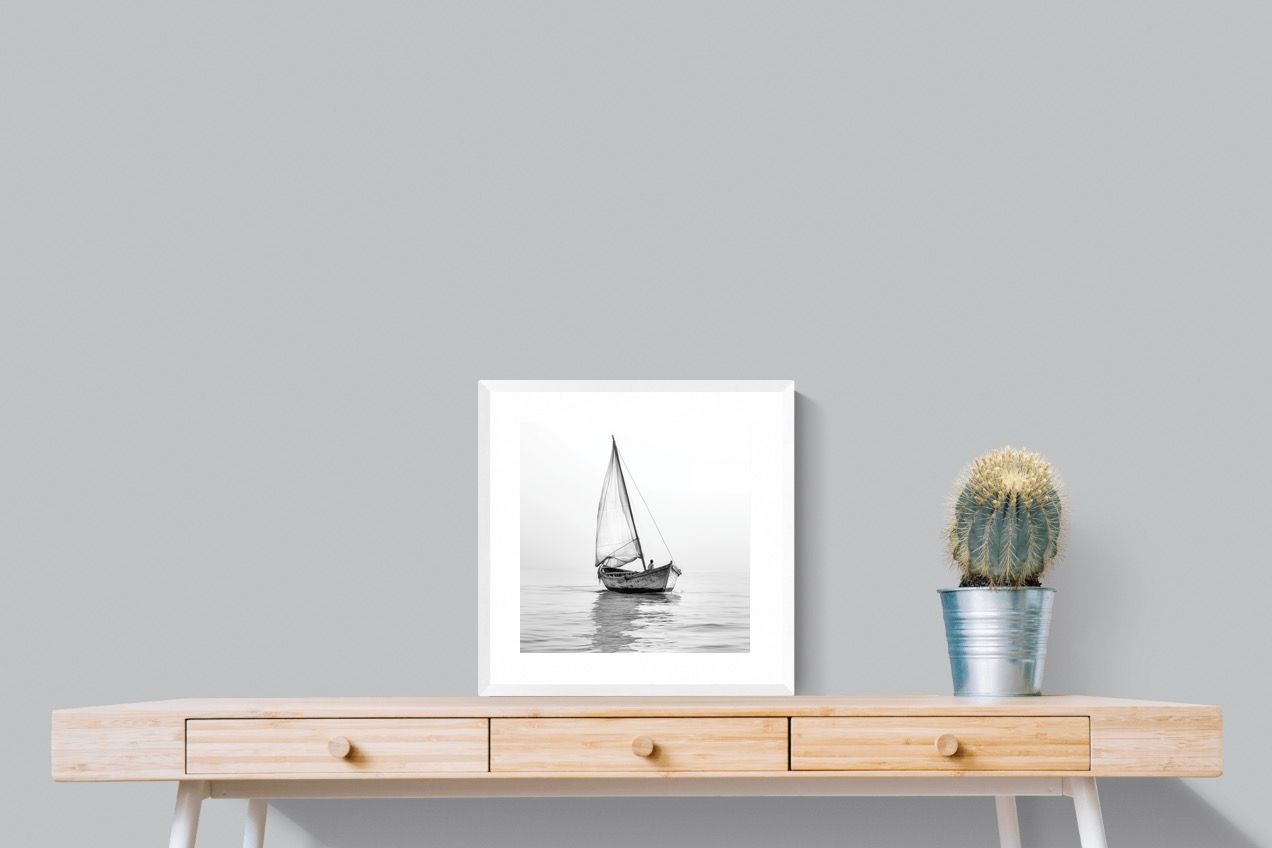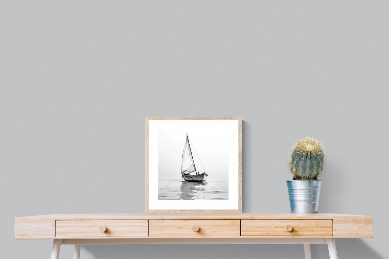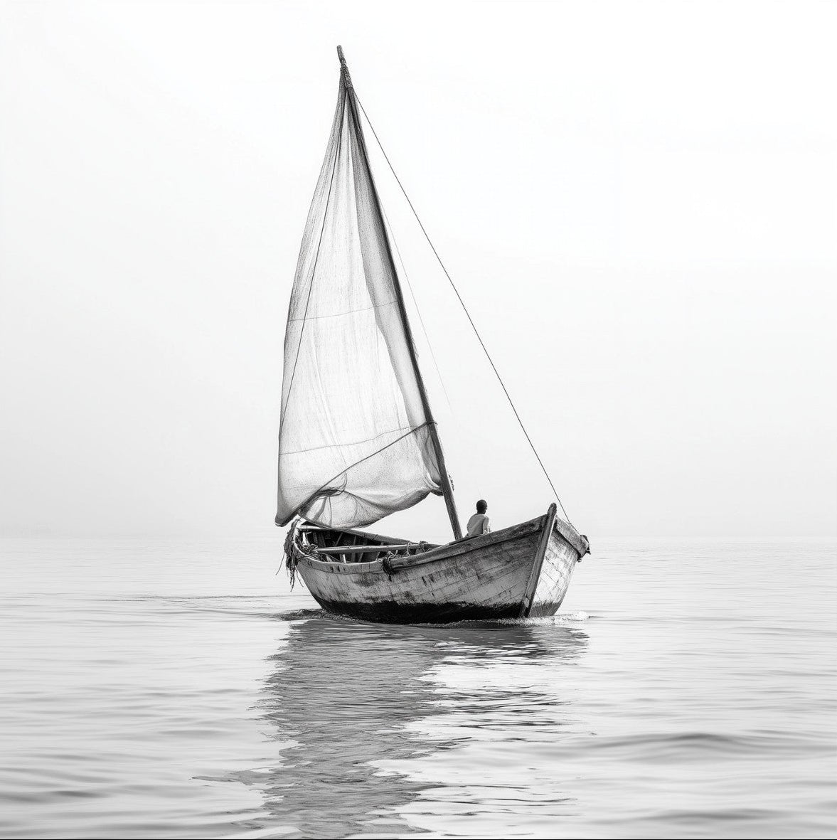 This image captures a fisherman on a small Uroa fishing dhow, setting out across calm waters. The high-key black-and-white palette evokes serenity and solitude, emphasising the beauty of simplicity and reflection. As wall art, it would complement a contemporary home with its minimalist composition and tranquil mood. The soft tones and open space invite calm and introspection, making it a perfect addition to a peaceful, modern living environment.