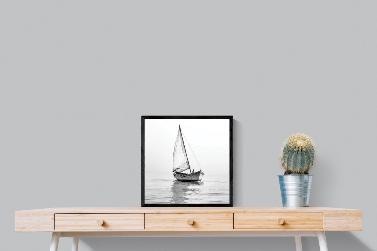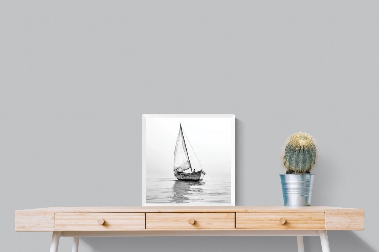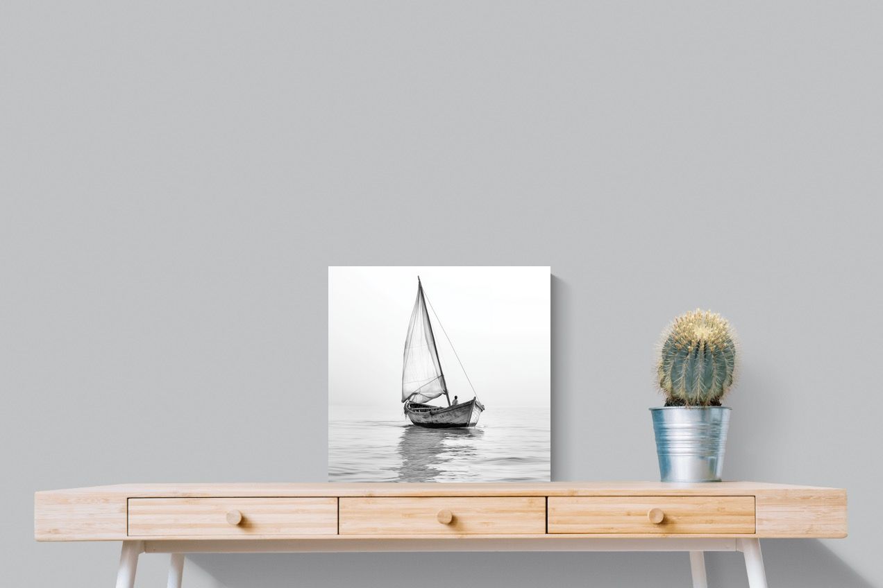 This image captures a fisherman on a small Uroa fishing dhow, setting out across calm waters. The high-key black-and-white palette evokes serenity and solitude, emphasising the beauty of simplicity and reflection. As wall art, it would complement a contemporary home with its minimalist composition and tranquil mood. The soft tones and open space invite calm and introspection, making it a perfect addition to a peaceful, modern living environment.