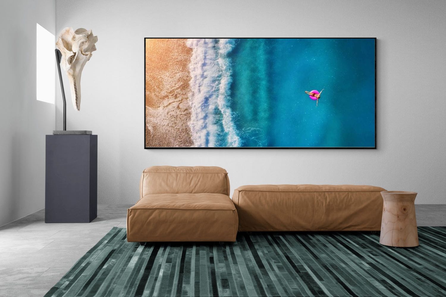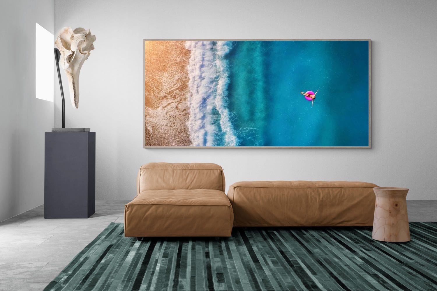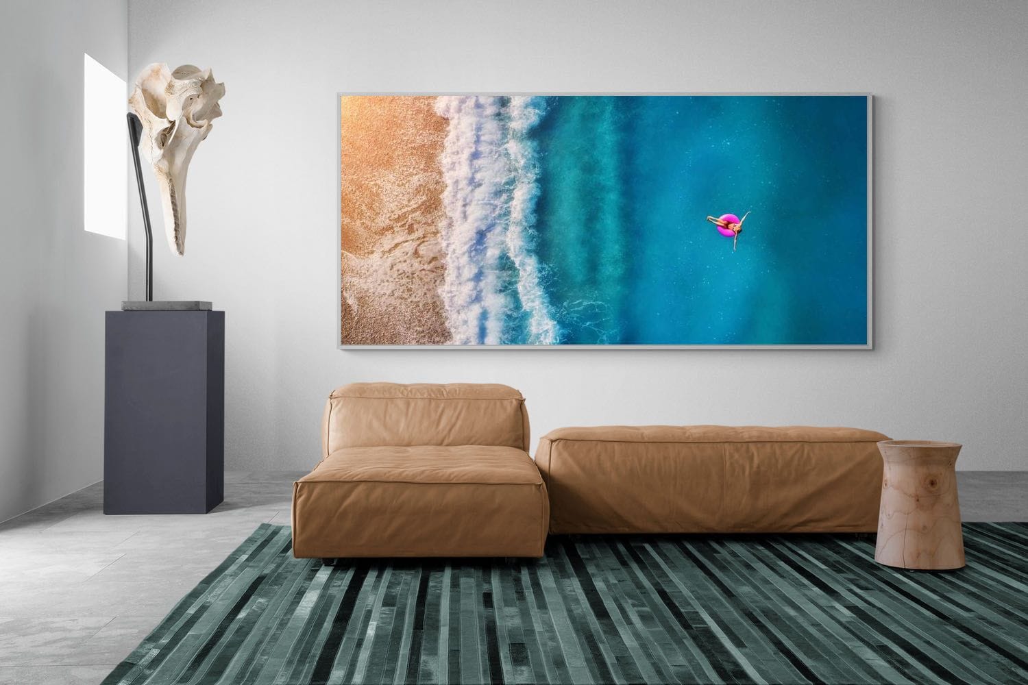 Shot in Ölüdeniz, a resort village on the southwest coast of Turkey, from above, a lone swimmer drifts peacefully on a bright pink float in deep turquoise water beside a sweeping sandy shoreline. White waves trace elegant patterns where the ocean meets the beach, creating striking contrast and balance. The wide aerial composition emphasises calm, space and colour. Fresh and contemporary, this artwork brings a relaxed coastal atmosphere to modern living rooms, bedrooms or interiors inspired by summer and ocean horizons.