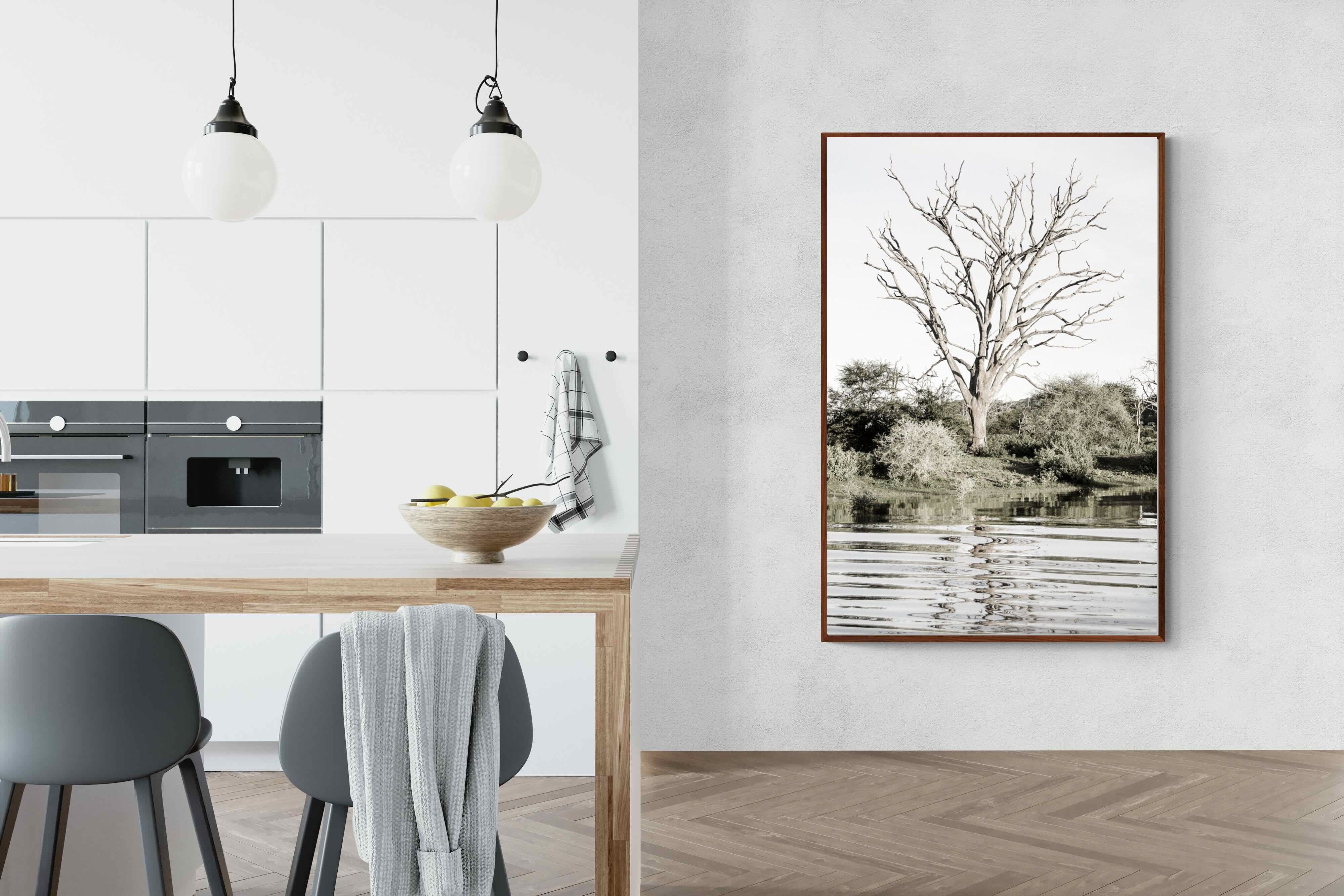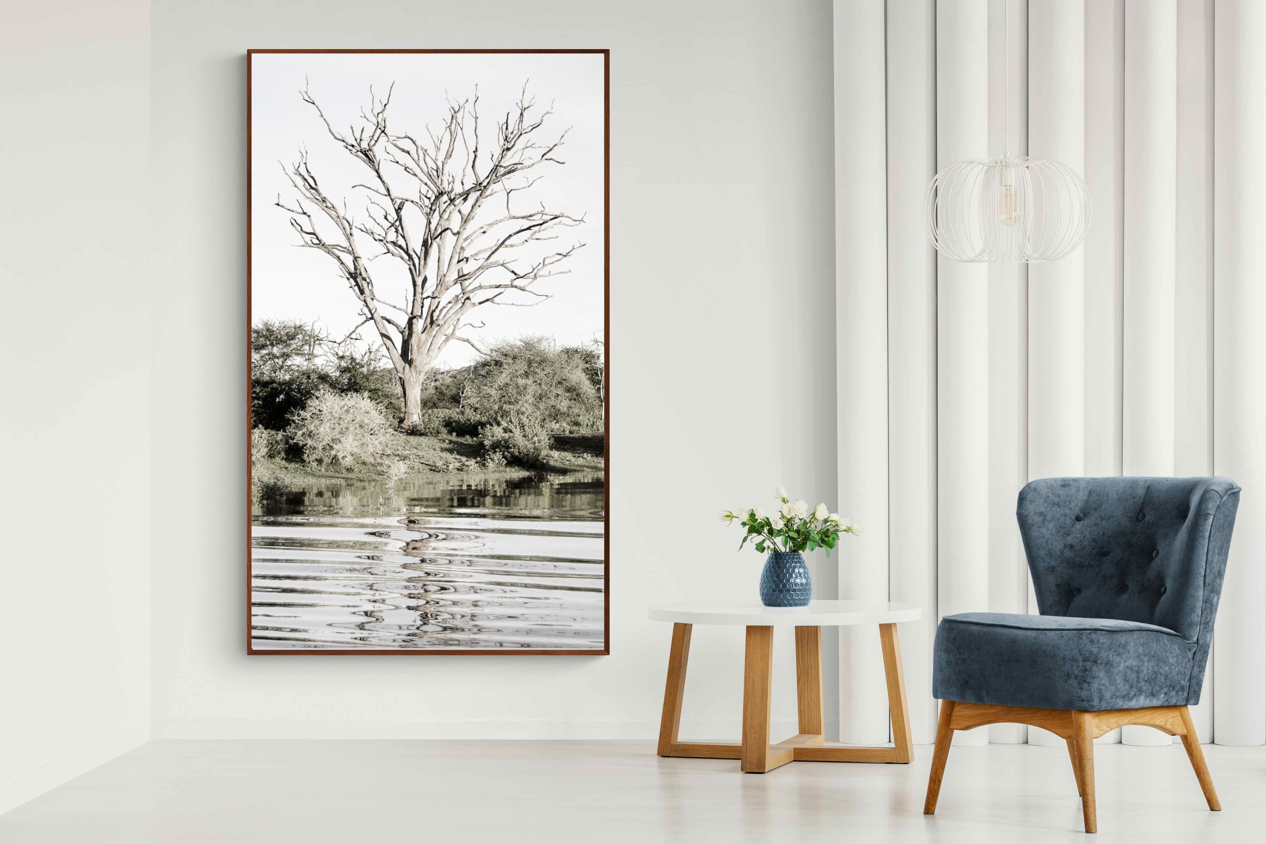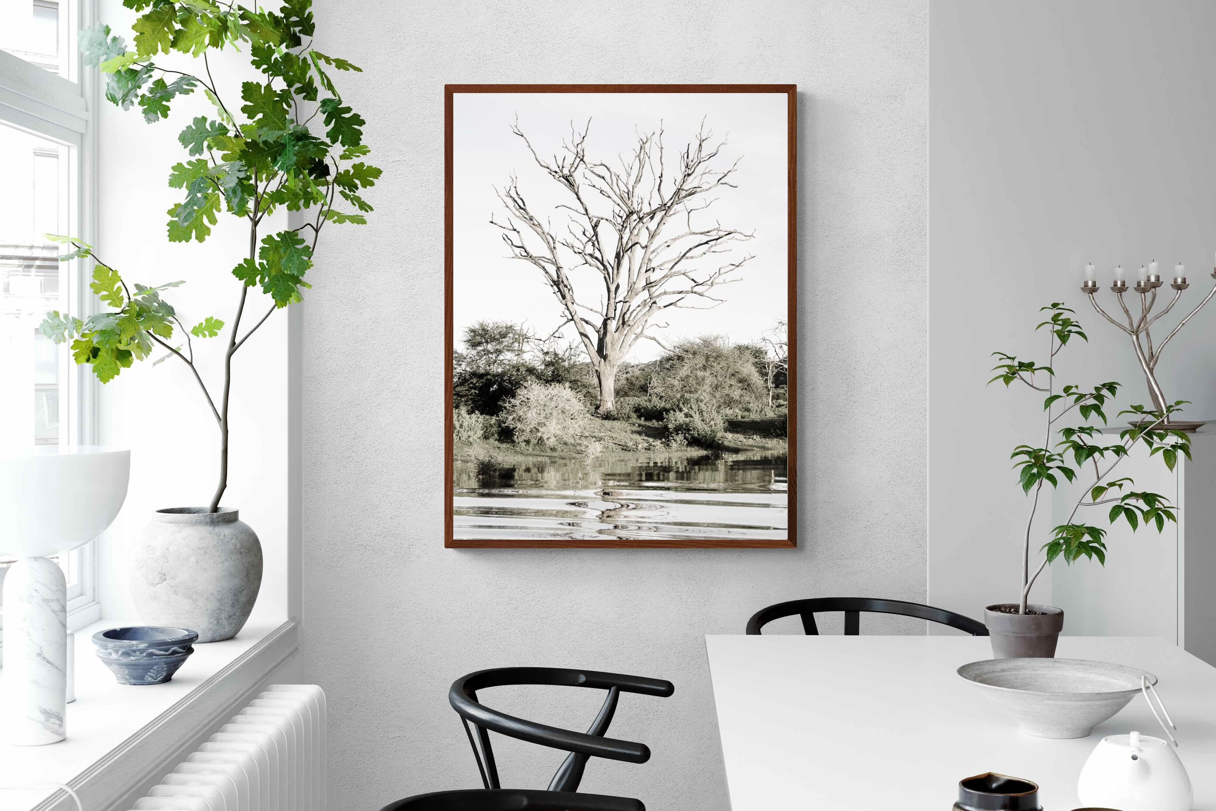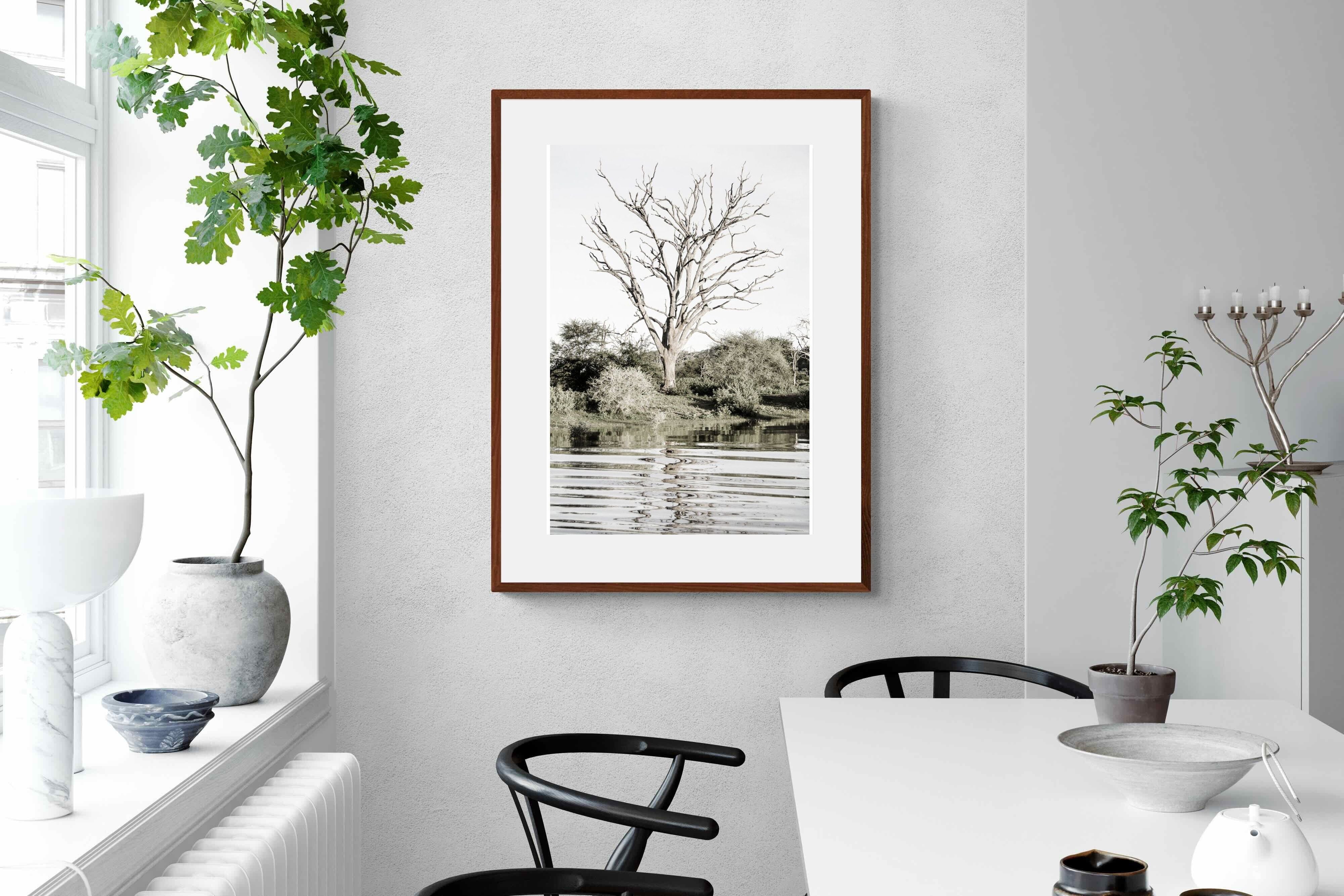 This captivating photograph, Reflective Ripples, beautifully showcases a stark, leafless tree mirrored in tranquil water. The smooth ripples contrast with the tree's intricate branches, creating a harmonious balance of movement and stillness. With its muted tones and minimalist composition, this artwork evokes a sense of peace, reflection, and natural beauty. Perfect for contemporary homes, it serves as a striking centrepiece, inviting calm and visual depth into any space.