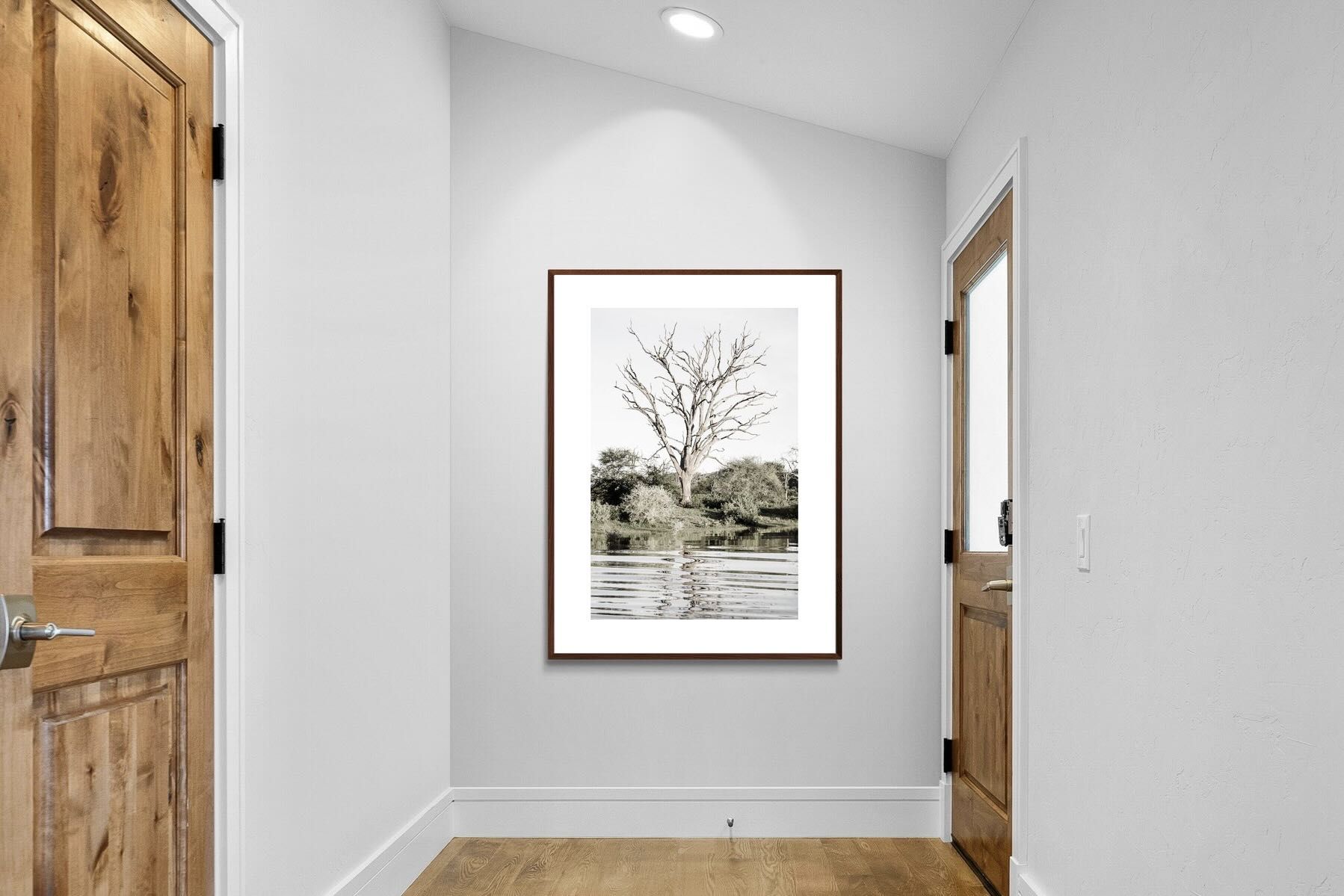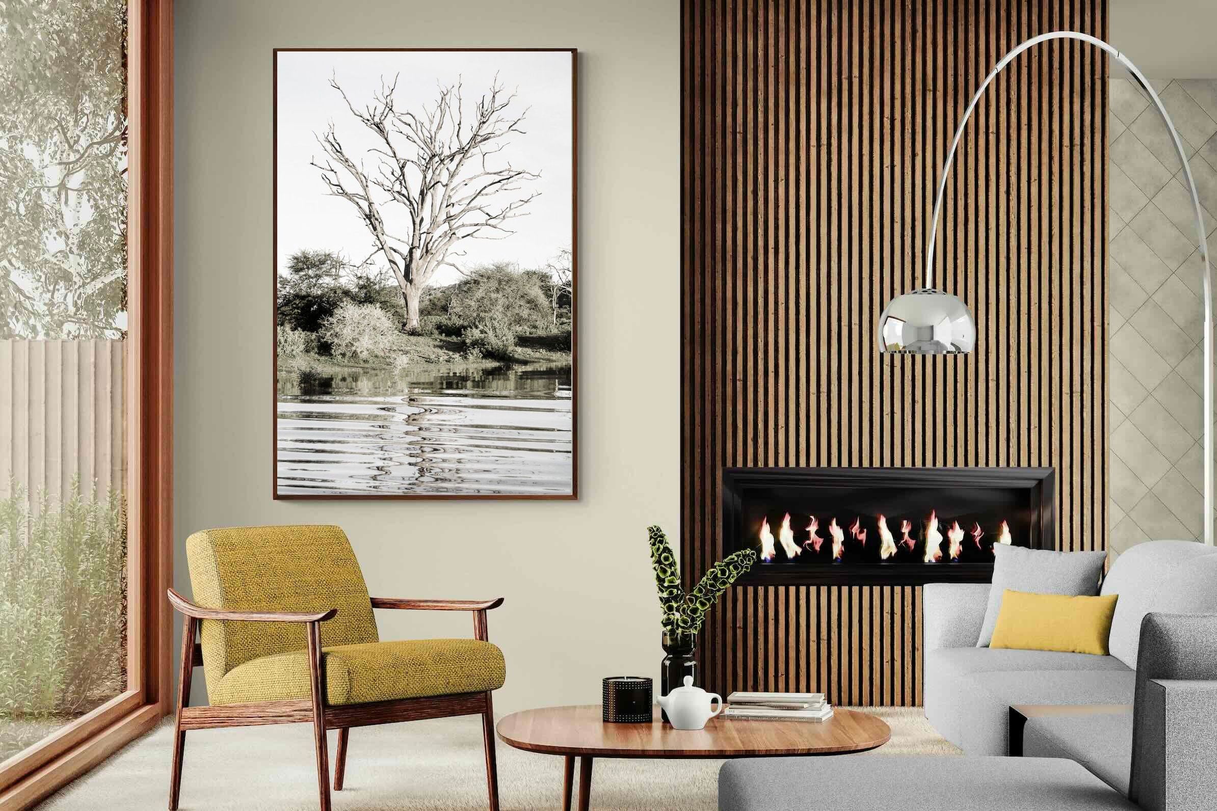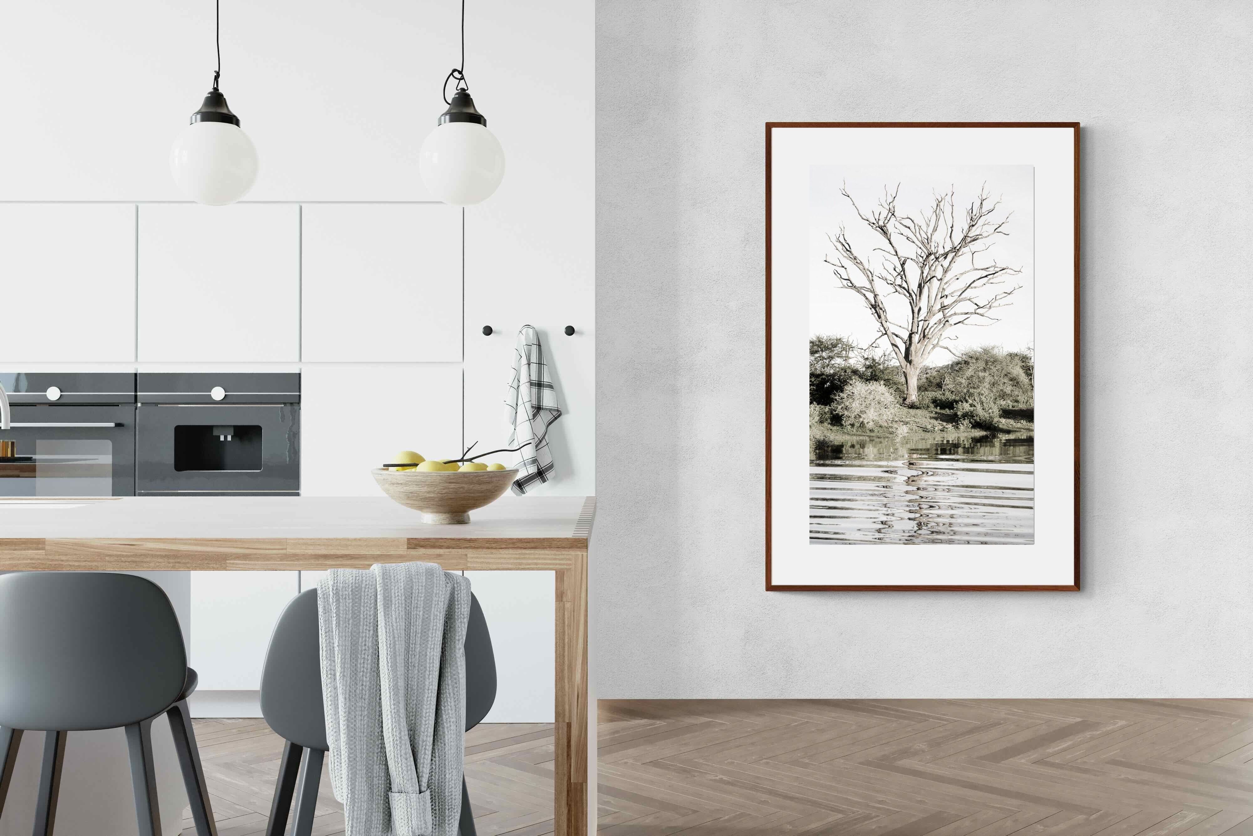 This captivating photograph, Reflective Ripples, beautifully showcases a stark, leafless tree mirrored in tranquil water. The smooth ripples contrast with the tree's intricate branches, creating a harmonious balance of movement and stillness. With its muted tones and minimalist composition, this artwork evokes a sense of peace, reflection, and natural beauty. Perfect for contemporary homes, it serves as a striking centrepiece, inviting calm and visual depth into any space.