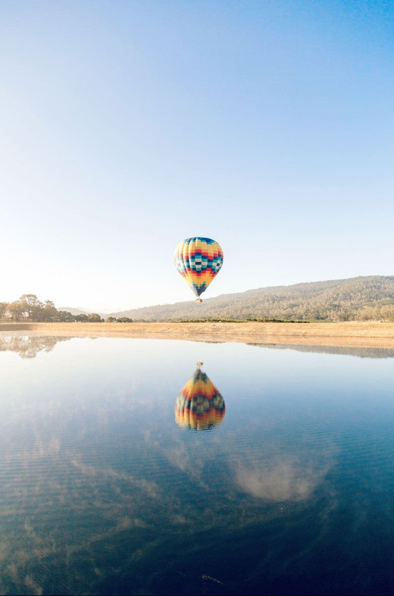 Captured at sunrise in the tranquil valleys of Napa Valley, California, this photograph shows a vibrant hot air balloon drifting above the still waters of a quiet lake. The striking colours of the balloon are mirrored perfectly on the surface, creating a serene and captivating image. The scene evokes a sense of peace and adventure. Ideal for contemporary homes, this piece will bring a touch of elegance, serenity, and vibrant energy to any living space.