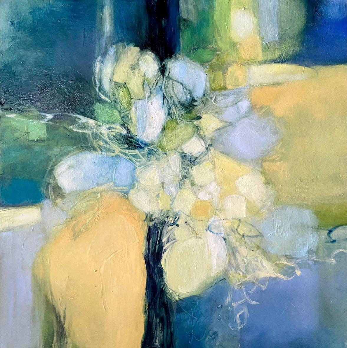 This floral artwork features soft, blended hues of blue, green, and yellow, with snapdragon flower forms emerging delicately from the background. The gentle, layered brushstrokes evoke the impression of flowers in bloom, yet remain ambiguous and open to interpretation. Its soothing colour palette and organic forms make it an ideal choice for contemporary spaces, offering a calming, dreamlike quality that adds depth and elegance to modern interiors, perfect for a tranquil living area.