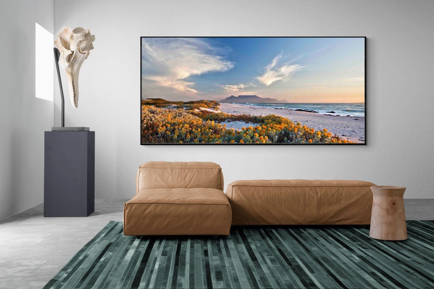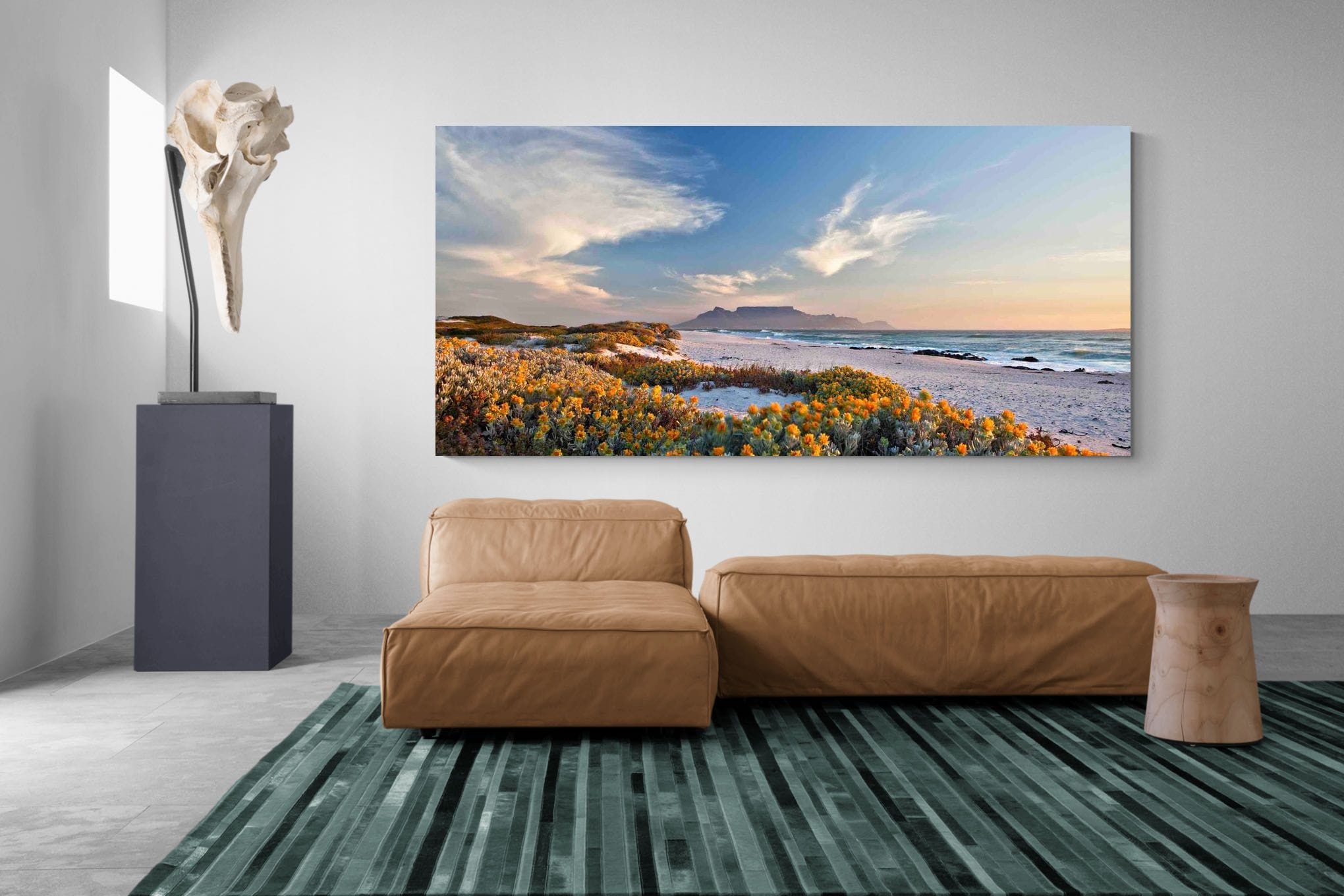 Wild coastal flowers bloom across the sandy dunes while the iconic silhouette of Table Mountain rises in the distance across Table Bay. Soft evening light and sweeping clouds enhance the natural beauty of Cape Town’s dramatic coastline. The contrast between colourful foreground plants, open beach and distant mountains creates a striking sense of depth. Perfect for living rooms, beach homes or contemporary interiors celebrating South Africa’s remarkable landscapes.