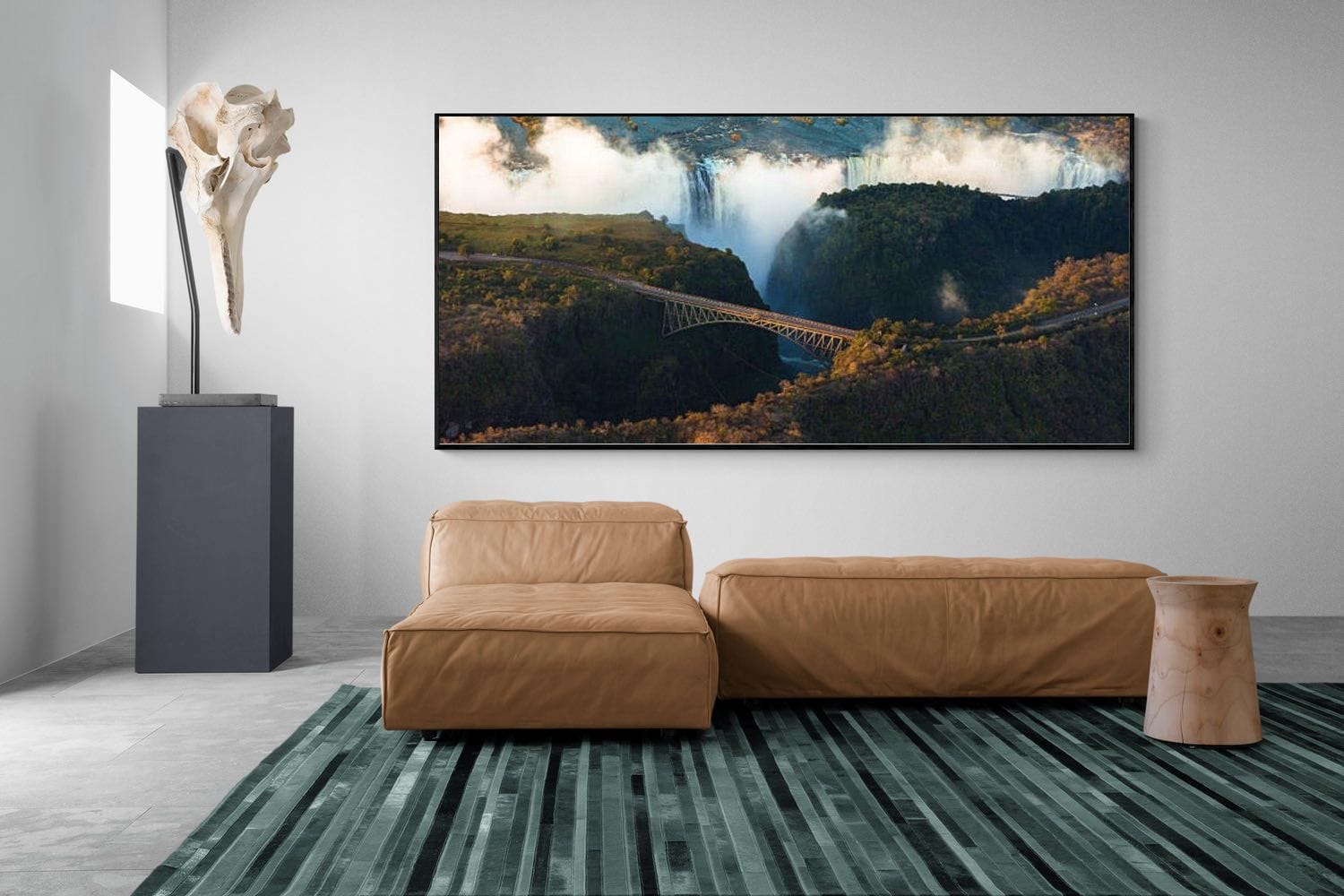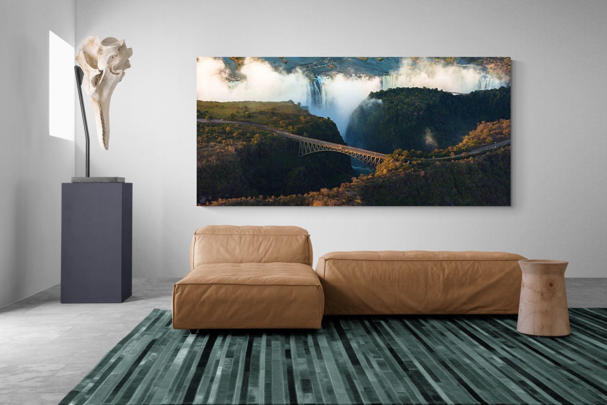 One of the world’s greatest natural spectacles unfolds as the Zambezi River plunges dramatically over the edge of Victoria Falls. Rising mist and thunderous water contrast with the elegant span of the historic bridge below, creating a breathtaking perspective from above. Lush vegetation and winding river channels add depth to this powerful landscape. This dramatic aerial photograph produces striking wall art, ideal for adventurous interiors, travel-inspired spaces or anyone captivated by Africa’s most iconic natural wonders.