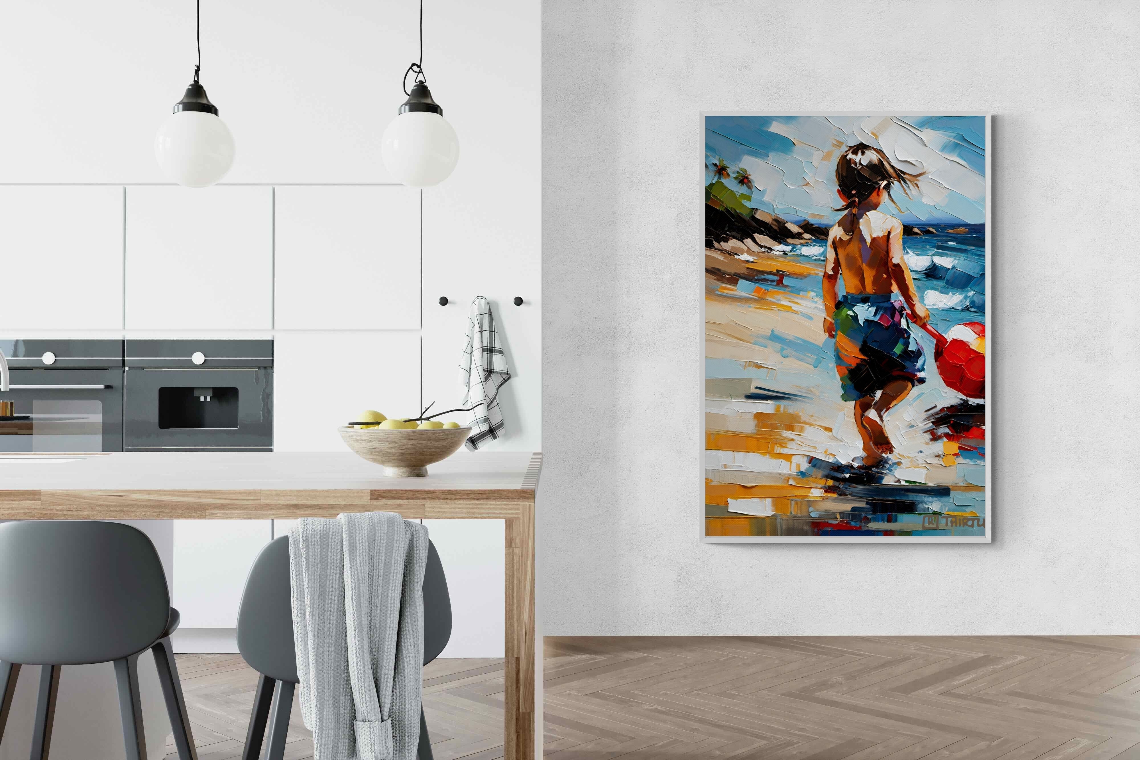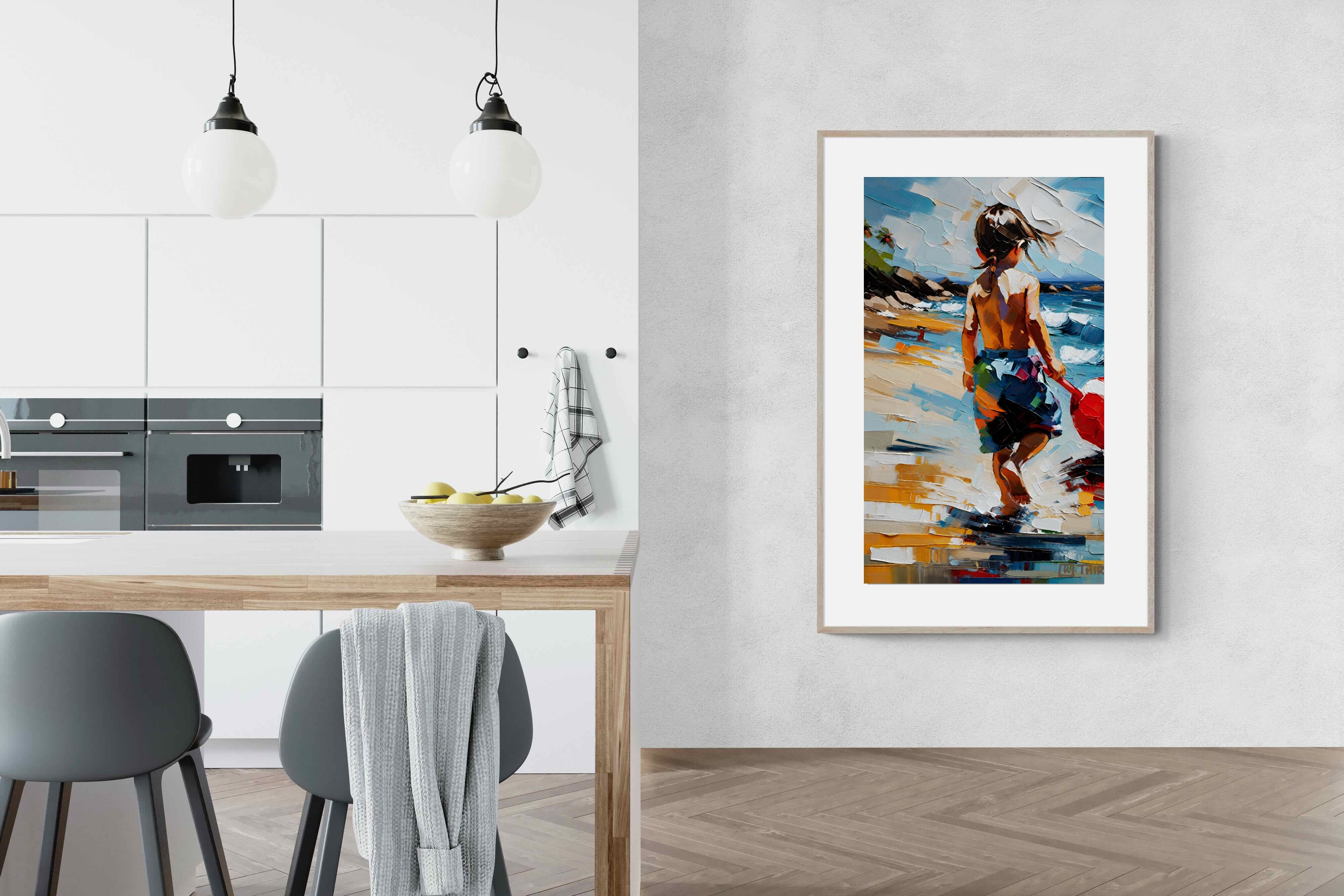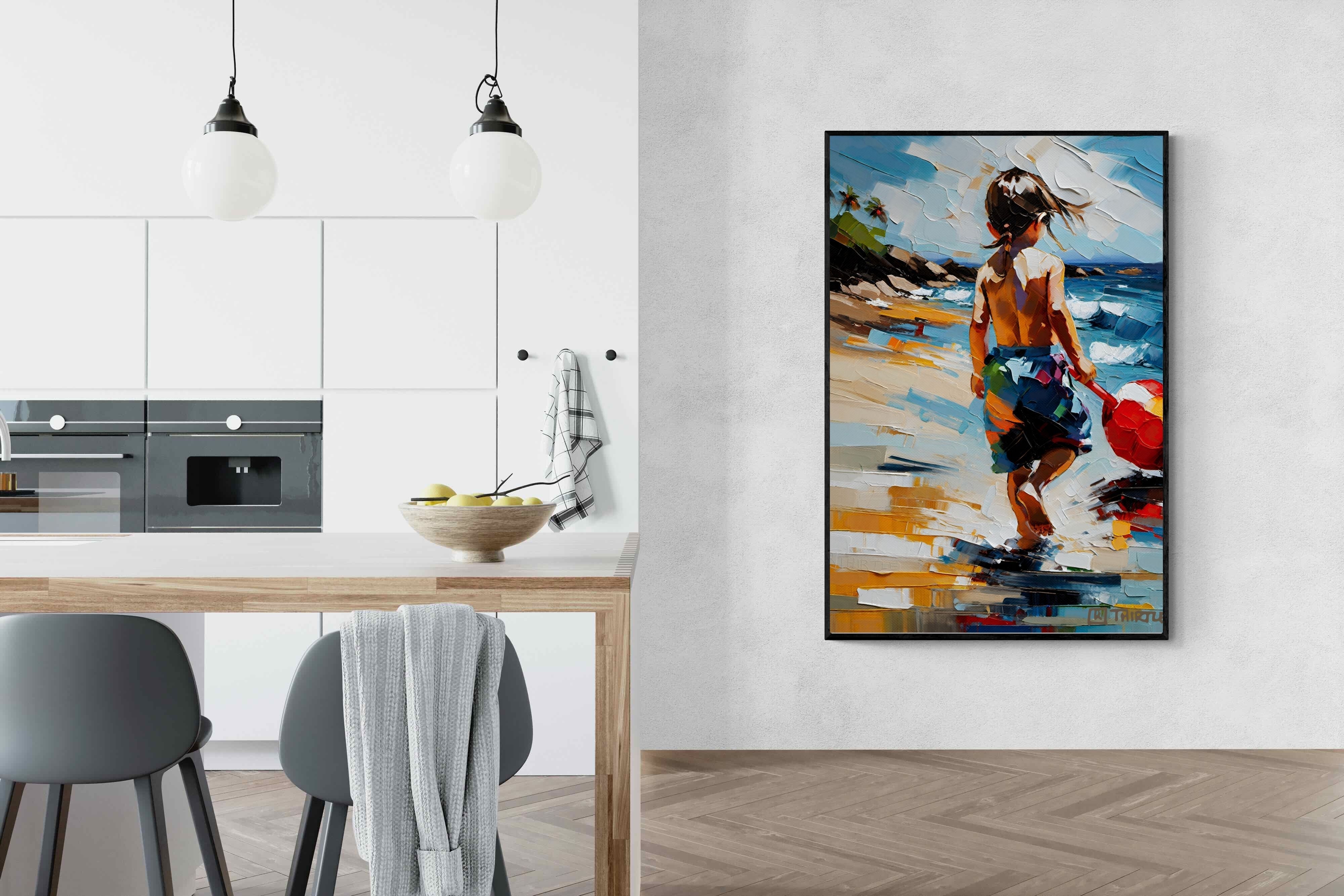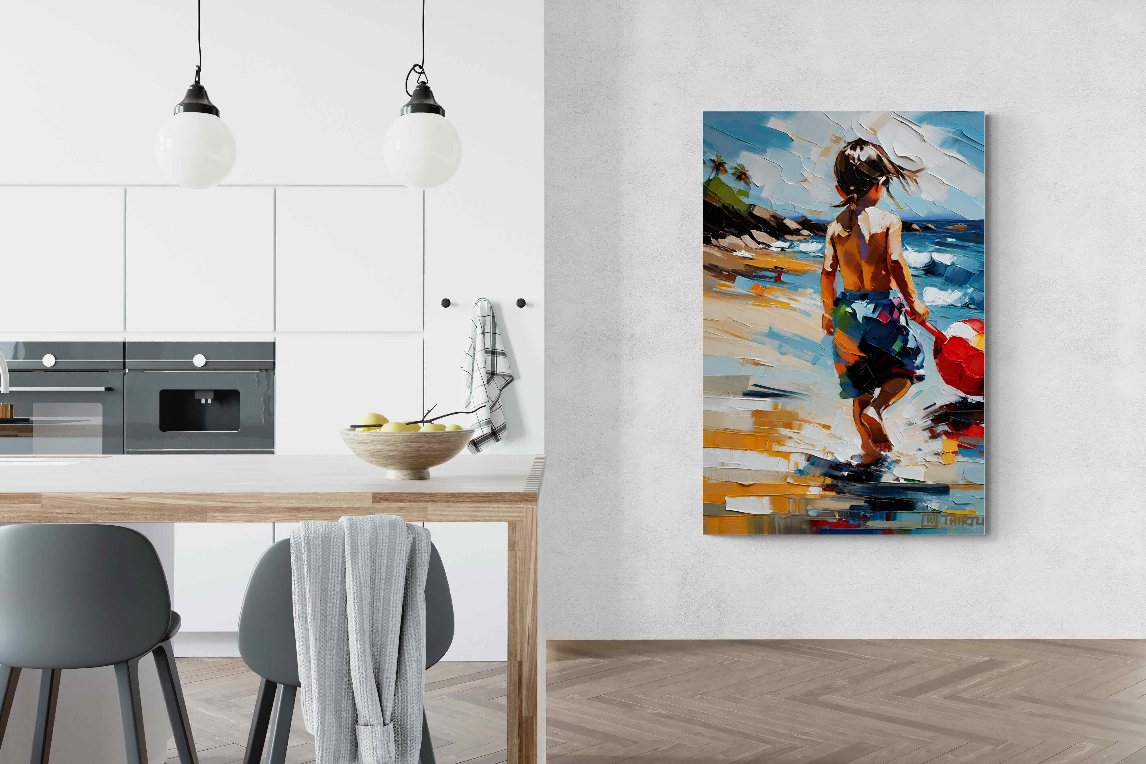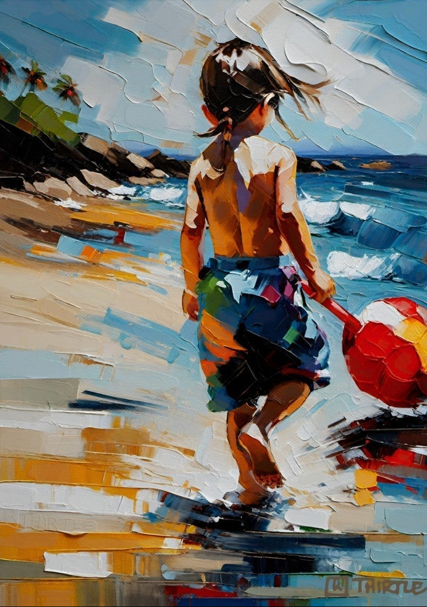 "Vivid Shore" captures a child's tranquil moment by the shore, evoking the innocence of youth and the essence of summer. The vivid, impressionistic strokes of colour create a lively, yet soothing atmosphere, ideal for bringing a touch of warmth and nostalgia to any living space. This artwork's dynamic composition and cheerful palette make it an uplifting focal point, perfect for inspiring daydreams of sunny days and carefree play by the water.