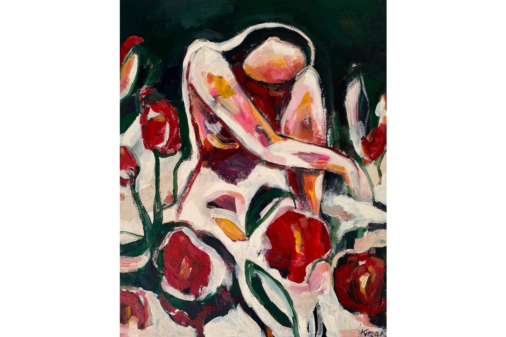 This expressive artwork combines a seated female figure with bold red flowers, creating a composition that feels both intimate and dramatic. Strong brushstrokes, layered colour and a dark backdrop give it depth, confidence and emotional presence. It would suit modern, eclectic or art-led interiors, especially living rooms, bedrooms or creative studios, where it can act as a striking focal point and introduce warmth, personality and a more gallery-inspired atmosphere.